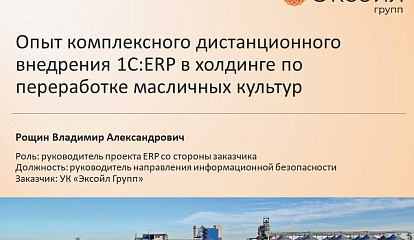 Опыт комплексного дистанционного внедрения 1C:ERP в холдинге по переработке масличных культур (онлайн-конференция "1С:ERP в облаках" 14 мая 2020 г., Рощин Владимир, УК "Эксойл Групп")