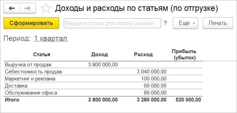 Все косвенные расходы можно оперативно увидеть в отчете Доходы и расходы по статьям (по отгрузке).