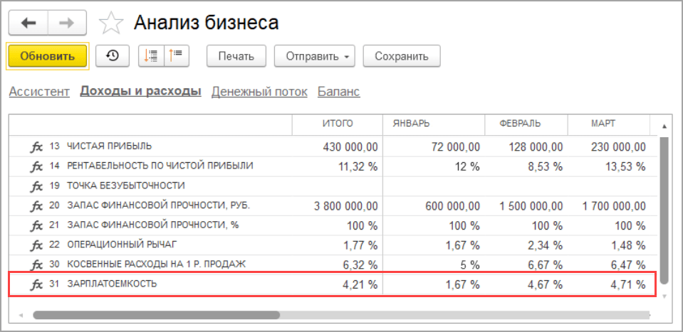 В отчете отслеживаем значение косвенных расходов по каждой статье. Для оценки эффективности каждой статьи используем возможность создавать свои показатели с использованием инструмента «Анализ бизнеса» (подробнее как создать показатель здесь).