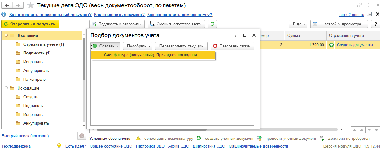 В зависимости от сложности документооборота можно обрабатывать документы вручную или настроить автоматическое правило создания документов при отправке и получении. Так, например, при отправке электронного УПД, включающего счет-фактуру и первичный документ, в программе будут сразу сформированы два документа учетной системы – «Приходная накладная» и «Счет-фактура полученный».