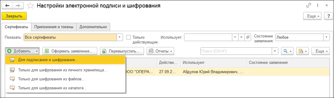 Сначала в «Настройках» флажком включаем возможность работы с электронными подписями и добавляем установленный на компьютере сертификат. Приложение автоматически проверит настройки, а в случае ошибки сообщит, что нужно исправить.
