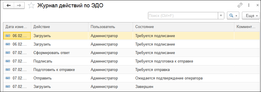 Информацию о движении документа, а также причину смены ответственного можно просмотреть в «Журнале действий по ЭДО», вызываемом из меню «Еще» открытого электронного документа.