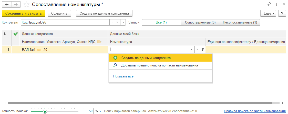 При первом обмене документами программа подскажет, как сопоставить товары вашей базы с аналогичными товарами контрагента. Можно выбрать существующий товар или создать новый, в том числе по данным контрагента.