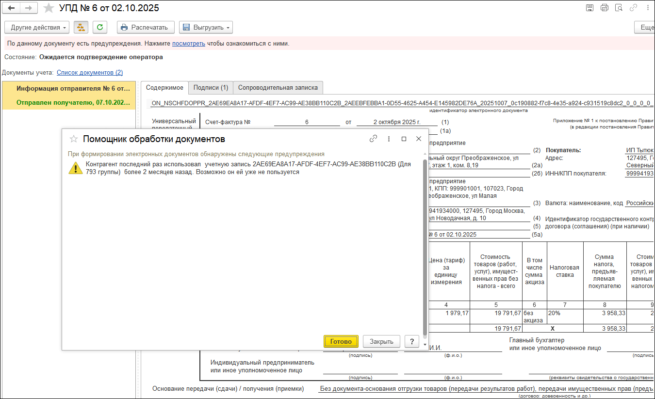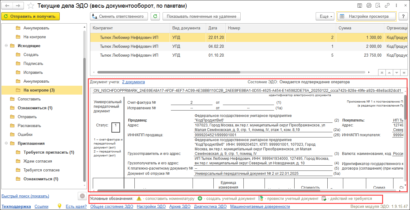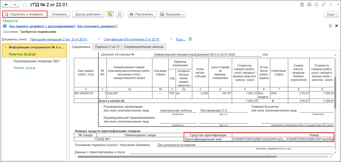Если все товары в наличии, можно переслать поставщику электронное подтверждение поступления. Электронная версия документа отправляется из обычного прикладного документа «Приходная накладная» с помощью команд специального меню «ЭДО». Для маркированных товаров в форме электронного УПД будут отображаться сведения о кодах.