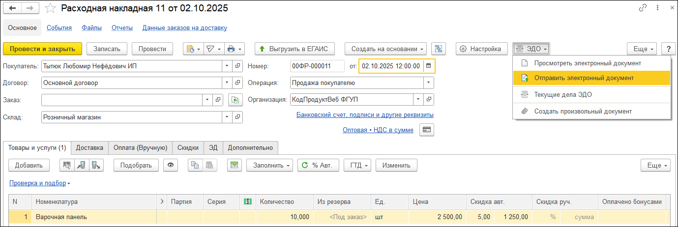 Аналогичным образом при оптовой продаже электронный документ создается на основании прикладного. Все действия с ним можете выполнить из уже знакомого меню «ЭДО».