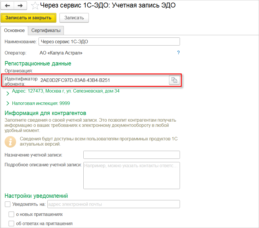 Далее следуем подсказкам и создаем учетную запись. Оператор ЭДО присвоит для нее уникальный идентификатор. Если у вас уже есть идентификатор абонента, то просто скопируйте и укажите его.