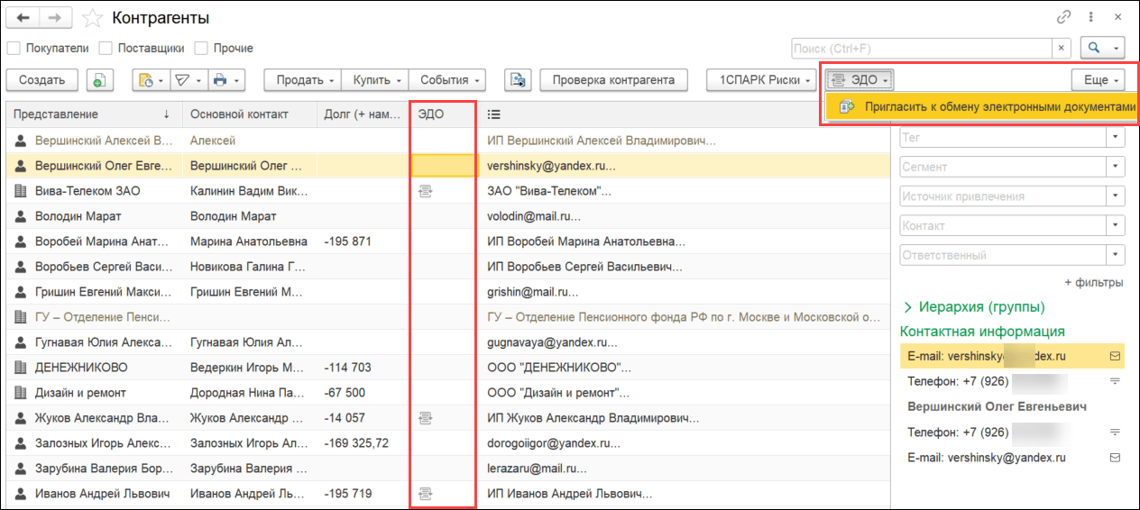 Например, если нужно составить двусторонний документ, то в «Регламенте ЭДО» выбираем вариант «Ожидаем ответную подпись». Если по согласию сторон формируется извещение о получении счета-фактуры, то указываем, что обязательно ожидаем извещение о получении. Контрагенту автоматически отправится письмо-приглашение с заданными условиями.Создать письмо с приглашением к обмену электронными документами можно и при работе со списком контрагентов. В колонке «ЭДО» доступна информация, кто из них уже перешел на электронный документооборот.