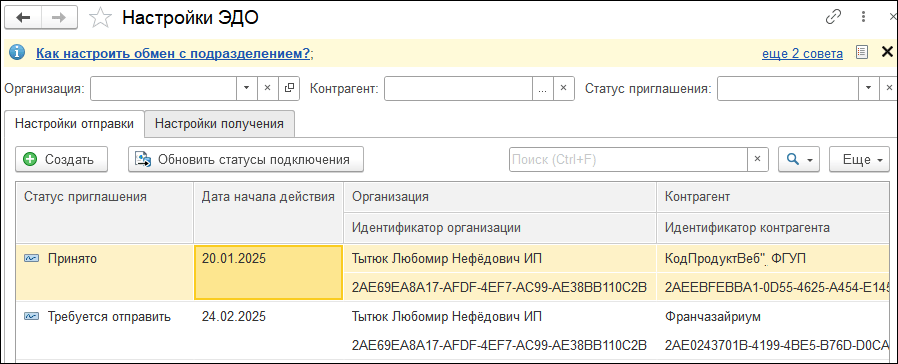 Письмо с текстом создается автоматически, но есть возможность отредактировать его перед отправкой.В «Статусе приглашения» всегда можно проверить, принял ли контрагент предложение к обмену и на каком этапе процесс подключения к ЭДО.