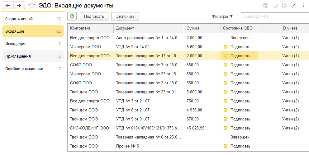 После оформления электронного документа поставщиком и обработки оператором ЭДО его можно увидеть в папке «Входящие» или в одной из вложенных в нее папок, в зависимости от требуемых действий.
