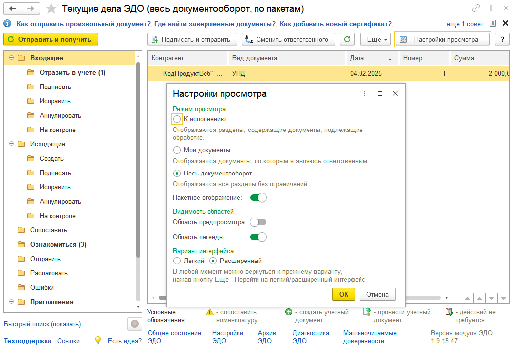 Получение новых документов выполняется по кнопке «Отправить и получить» или регламентным заданием по расписанию. Поступившие электронные документы отображаются в папке «Входящие», а также в отдельных вложенных в нее папках.