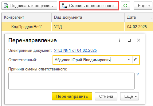 Ответственным по документу автоматически устанавливается пользователь, выполнивший его получение. При необходимости его можно сменить одноименной командой.