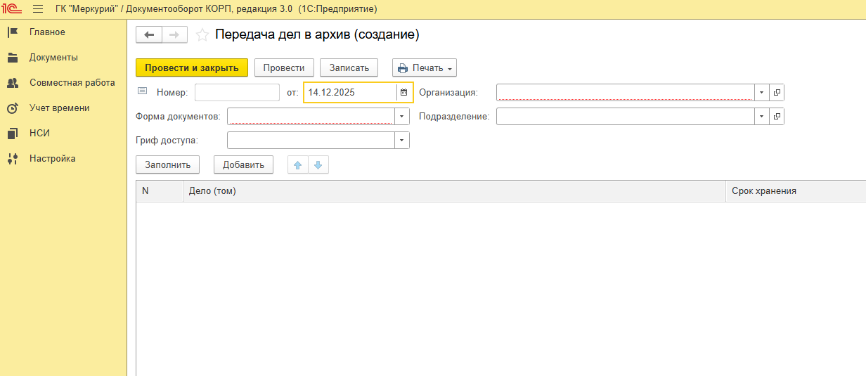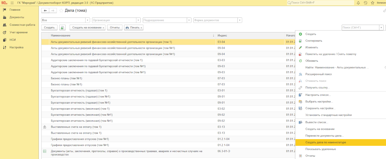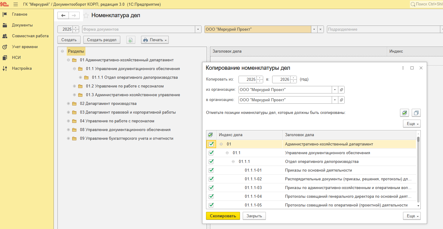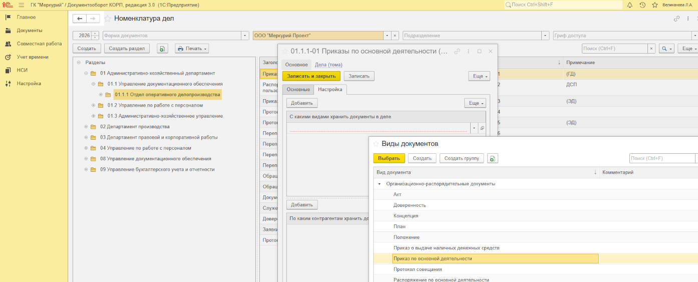 1. Создать в «1С:Документообороте» справочник «Номенклатура дел» на 2026 год. Для этого предварительно необходимо включить функционал «Вести учет по номенклатуре дел».