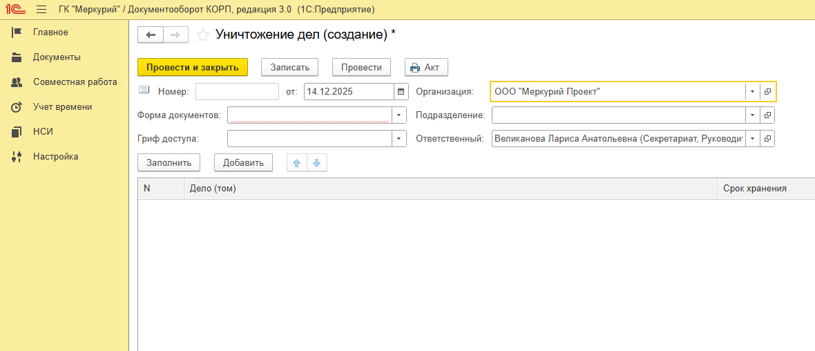 В «1С:Документообороте», воспользовавшись командой «Уничтожение дел», сформировать акт. На бумажные и электронные документы формируются отдельные акты, включающие дела, сроки хранения которых истекли. Печатную форму акта можно сохранить в системе как проект документа, направить на подписание руководителю структурного подразделения. На основе актов подразделений архивист в дальнейшем сформирует общий акт о выделении документов к уничтожению.