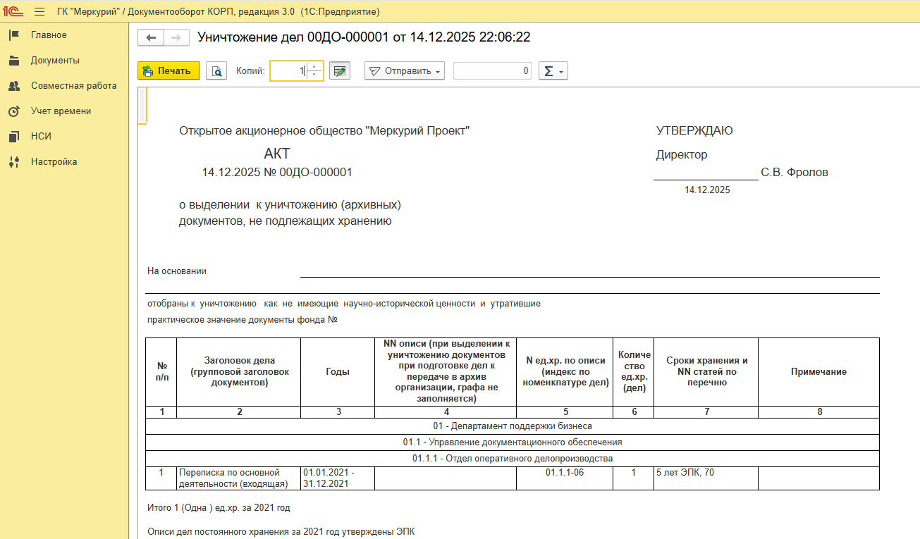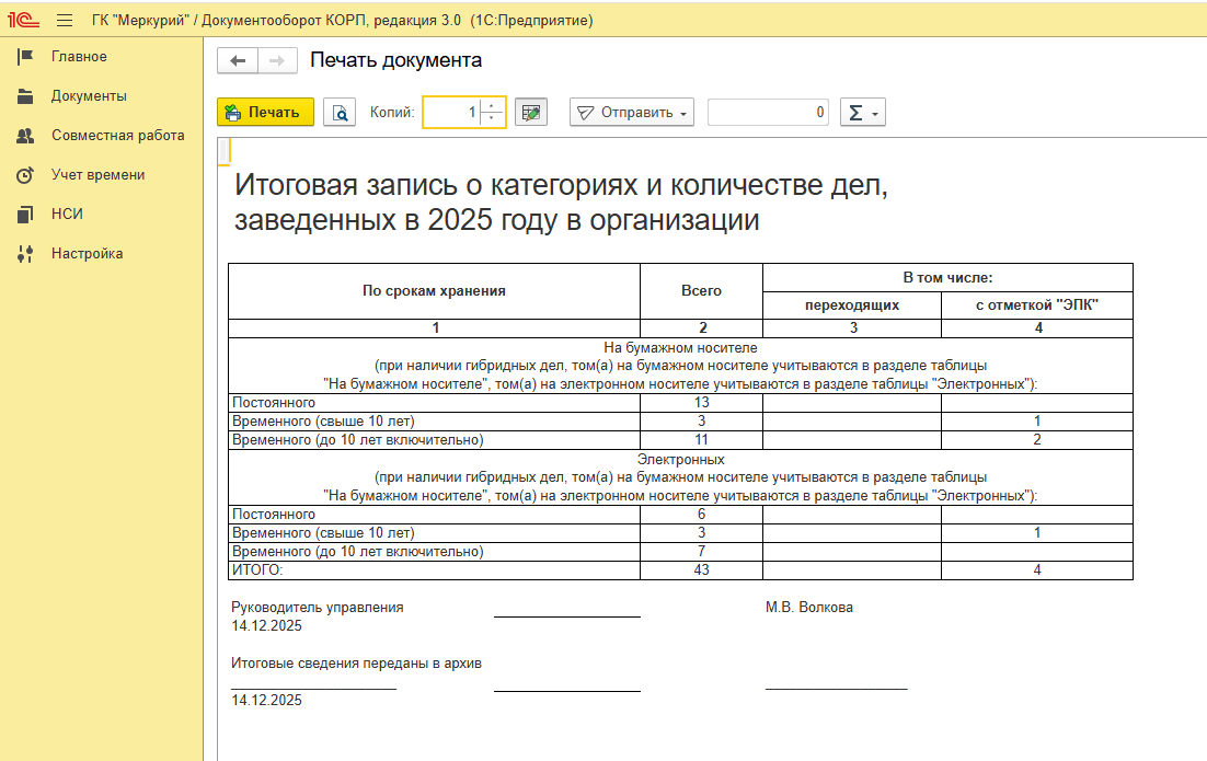 В «1С:Документообороте» есть печатная форма итоговой записи к номенклатуре дел. Данную форму подписывает руководитель службы делопроизводства и архива.