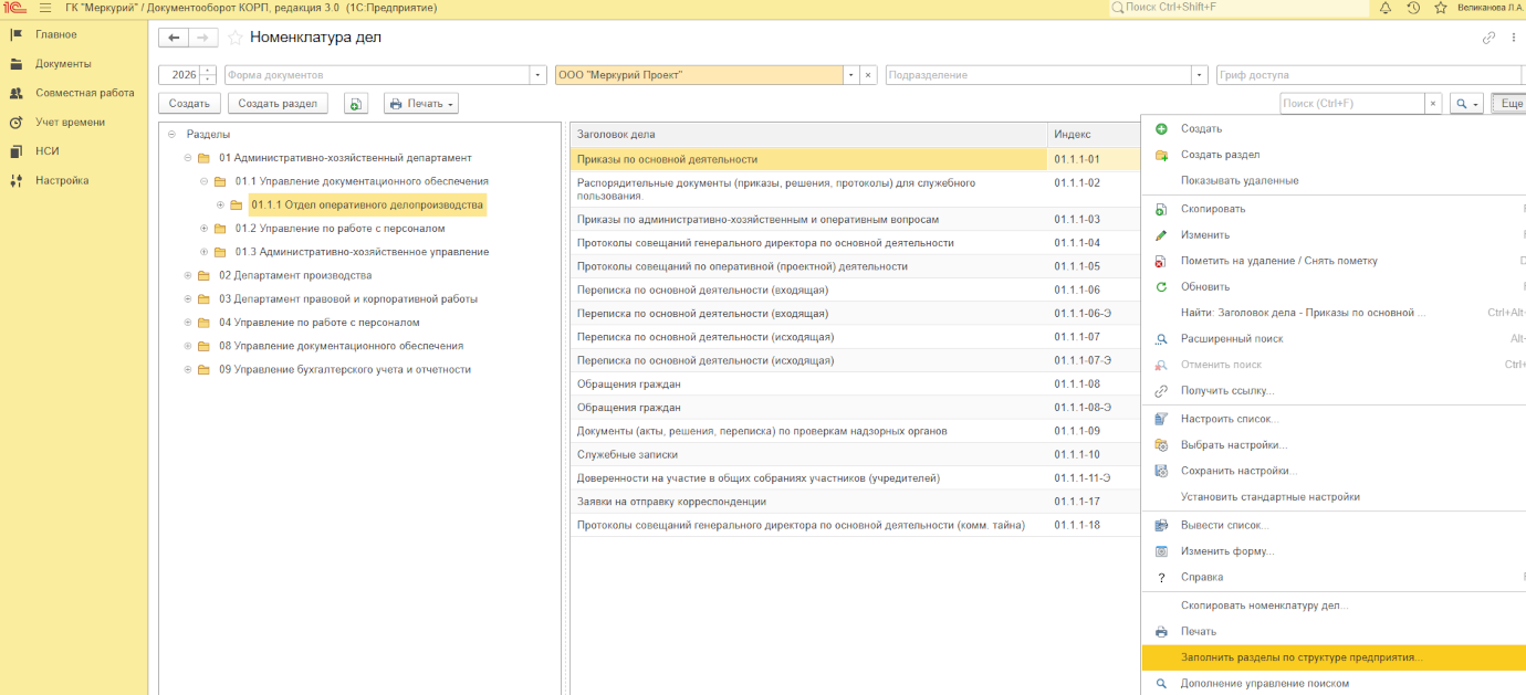 Номенклатура дел чаще строится по структурному признаку. В этом случае достаточно выбрать команду «Заполнить разделы номенклатуры дел по структуре предприятия».