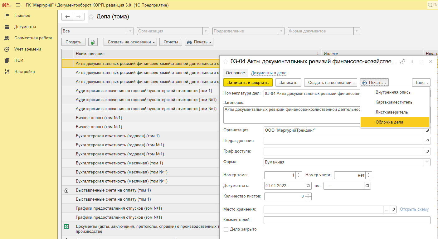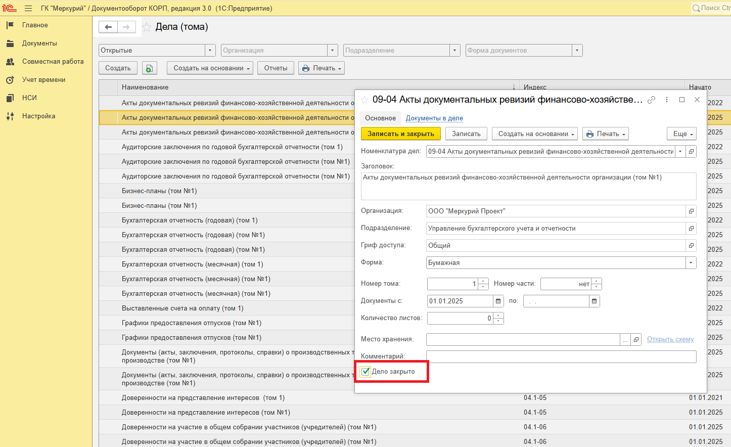 В «1С:Документообороте» дело считается закрытым, если закрыты все тома дела.