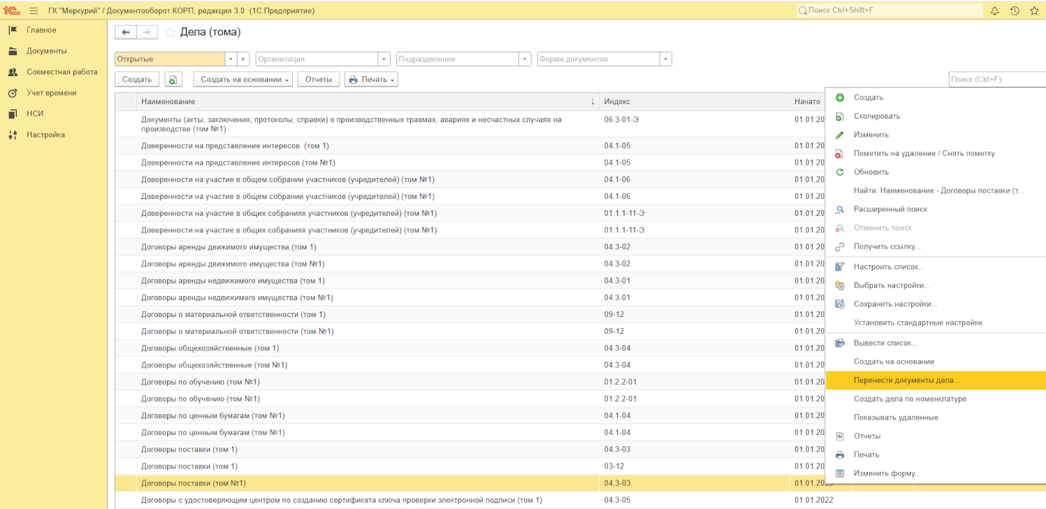 Создать в «1С:Документообороте» тома дел. Тома создаются для всех дел, за исключением не закрытых в текущем году.
