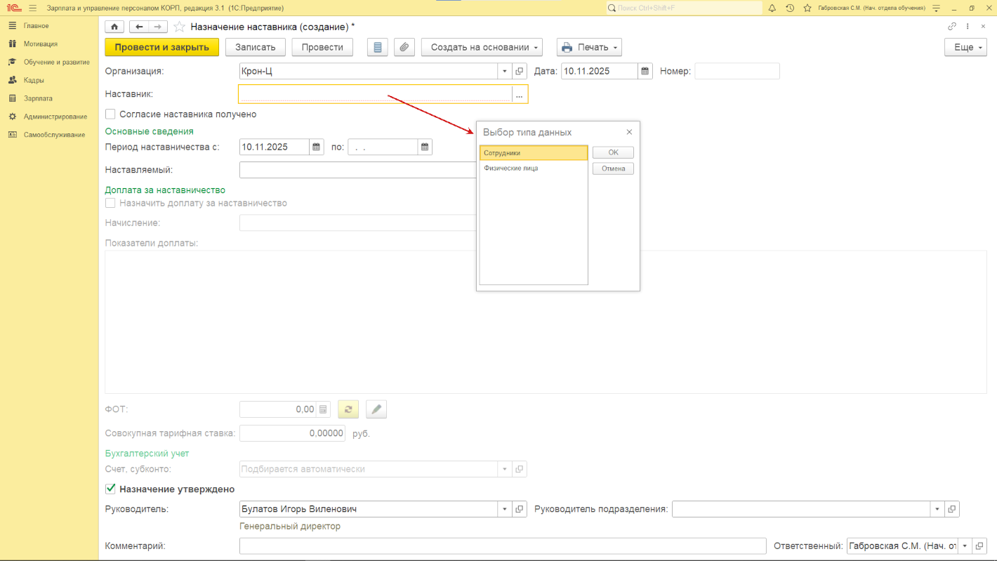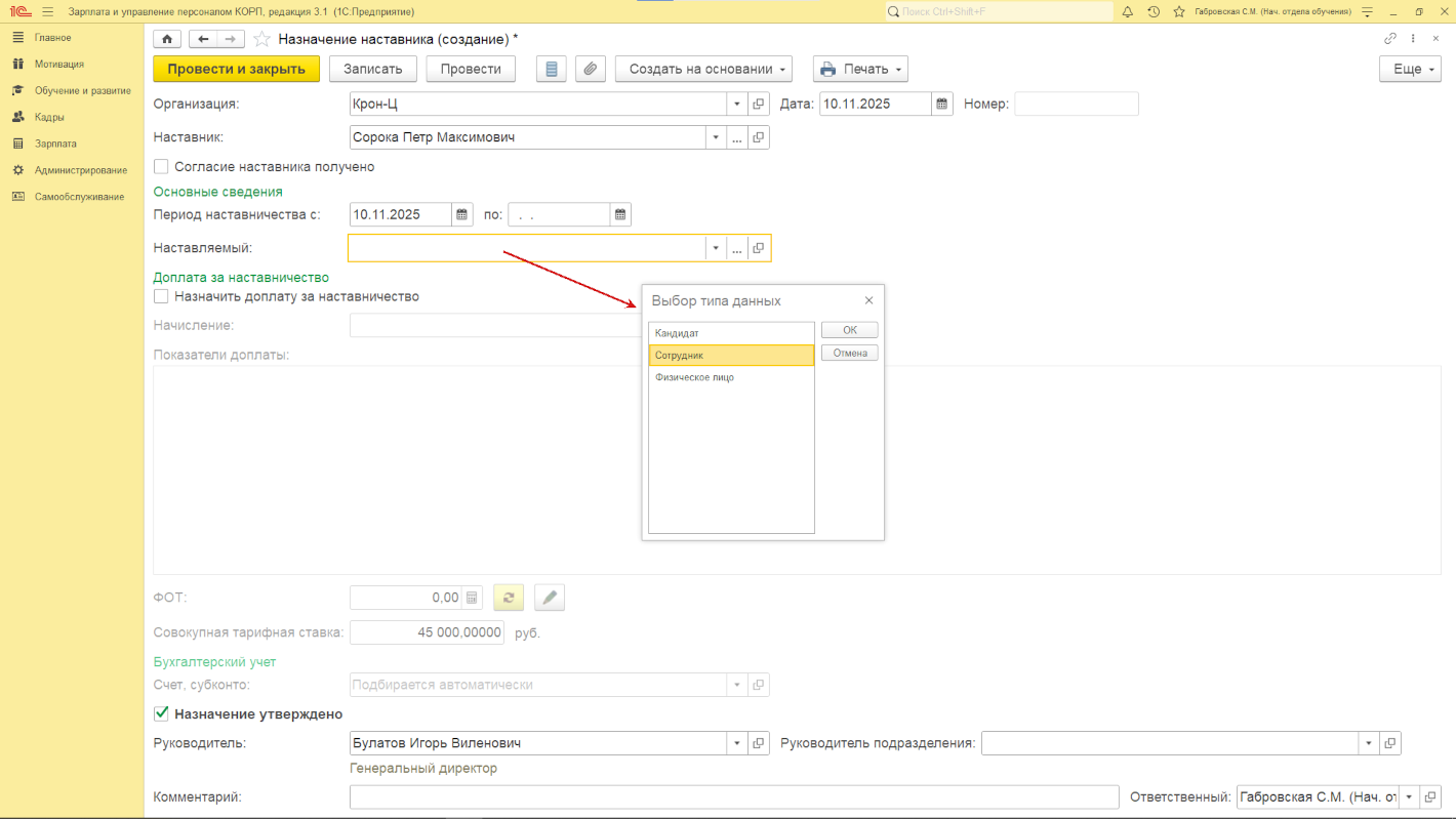 Наставляемого выбирают из списка сотрудников, физических лиц или кандидатов.