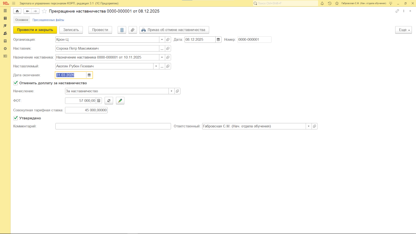 - Прекратить наставничество, ранее введенное документом Назначение наставничества. Обязательно нужно выбрать документ-основание (Назначение наставника);