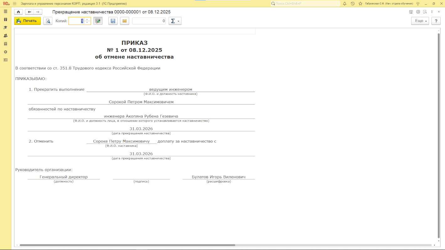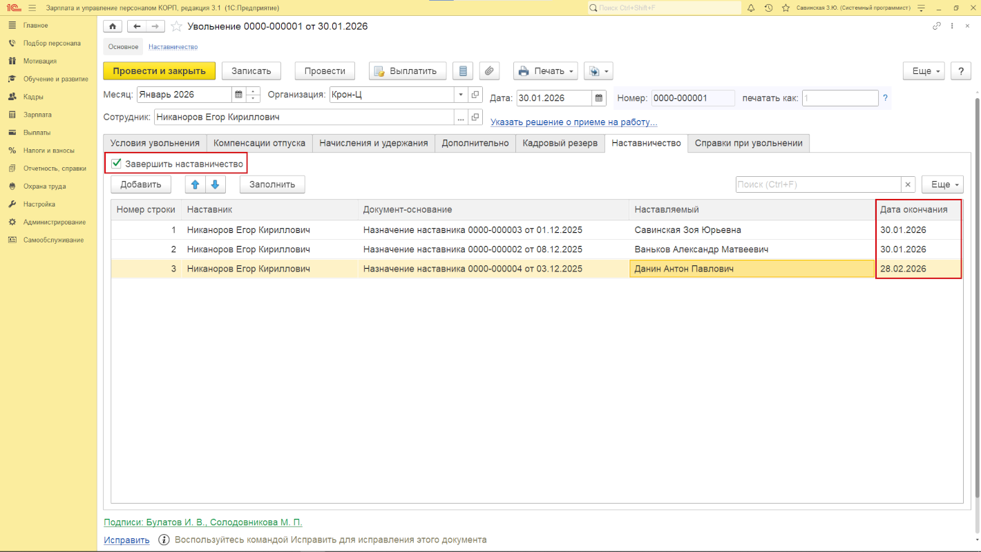 Пример. Уволен наставник. В документе Увольнение поставили отметку, что наставничество завершено. Автоматически заполнен список наставляемых, для каждого указана своя дата прекращения наставничества.