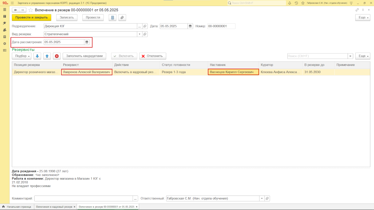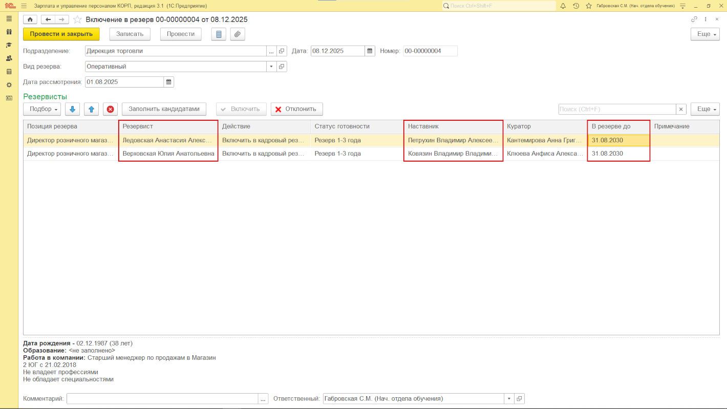 Пример. При включении сотрудников в резерв с 1.08.2025 указано, что пребывание в резерве закончится