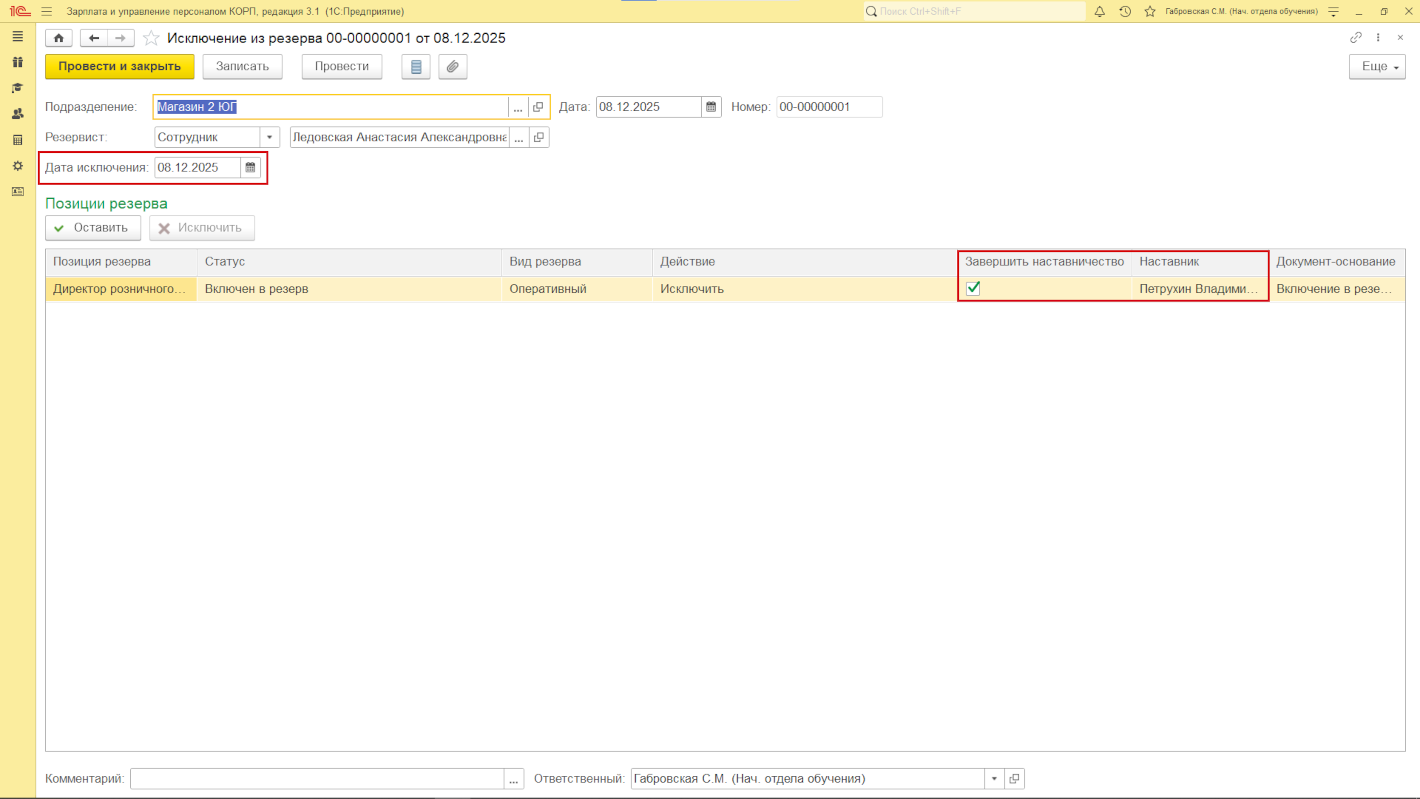 Пример. Сотрудник исключен из кадрового резерва 8.12.2025. Наставничество Петрухина В. над