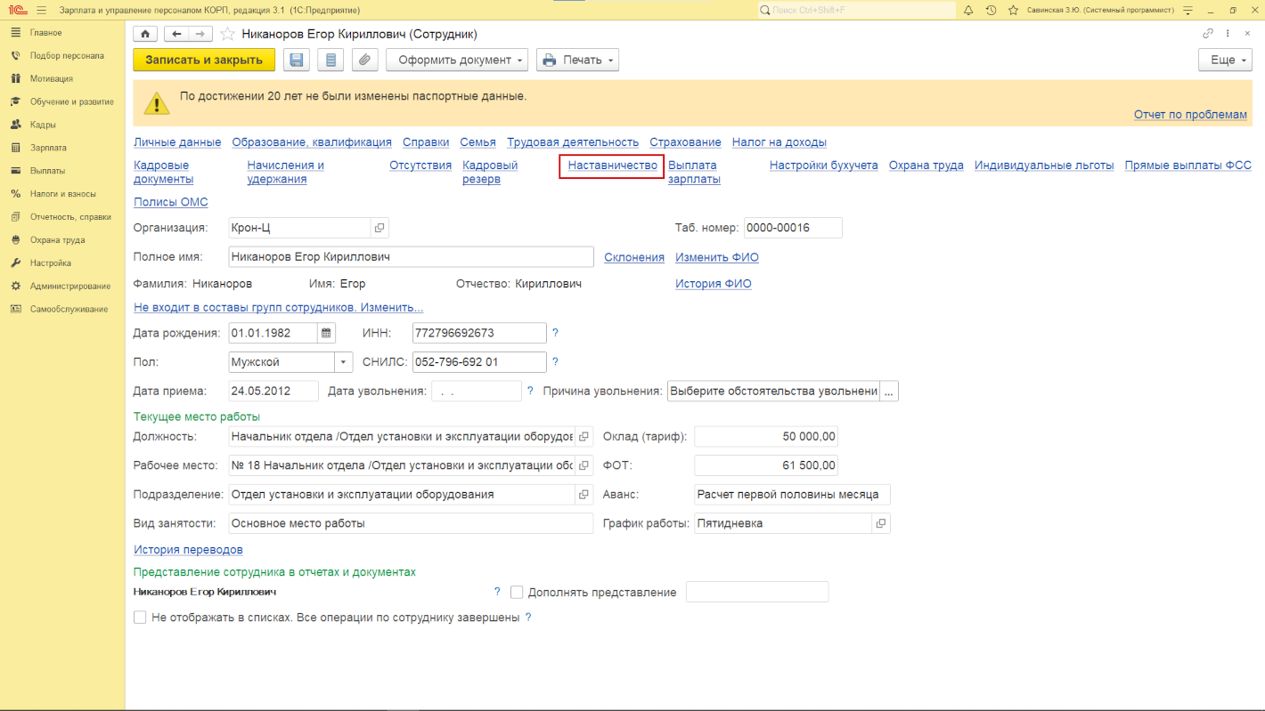 В карточке сотрудника добавлена гиперссылка Наставничество, по которой можно увидеть историю сотрудника как наставника или наставляемого.