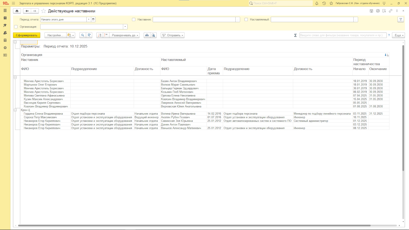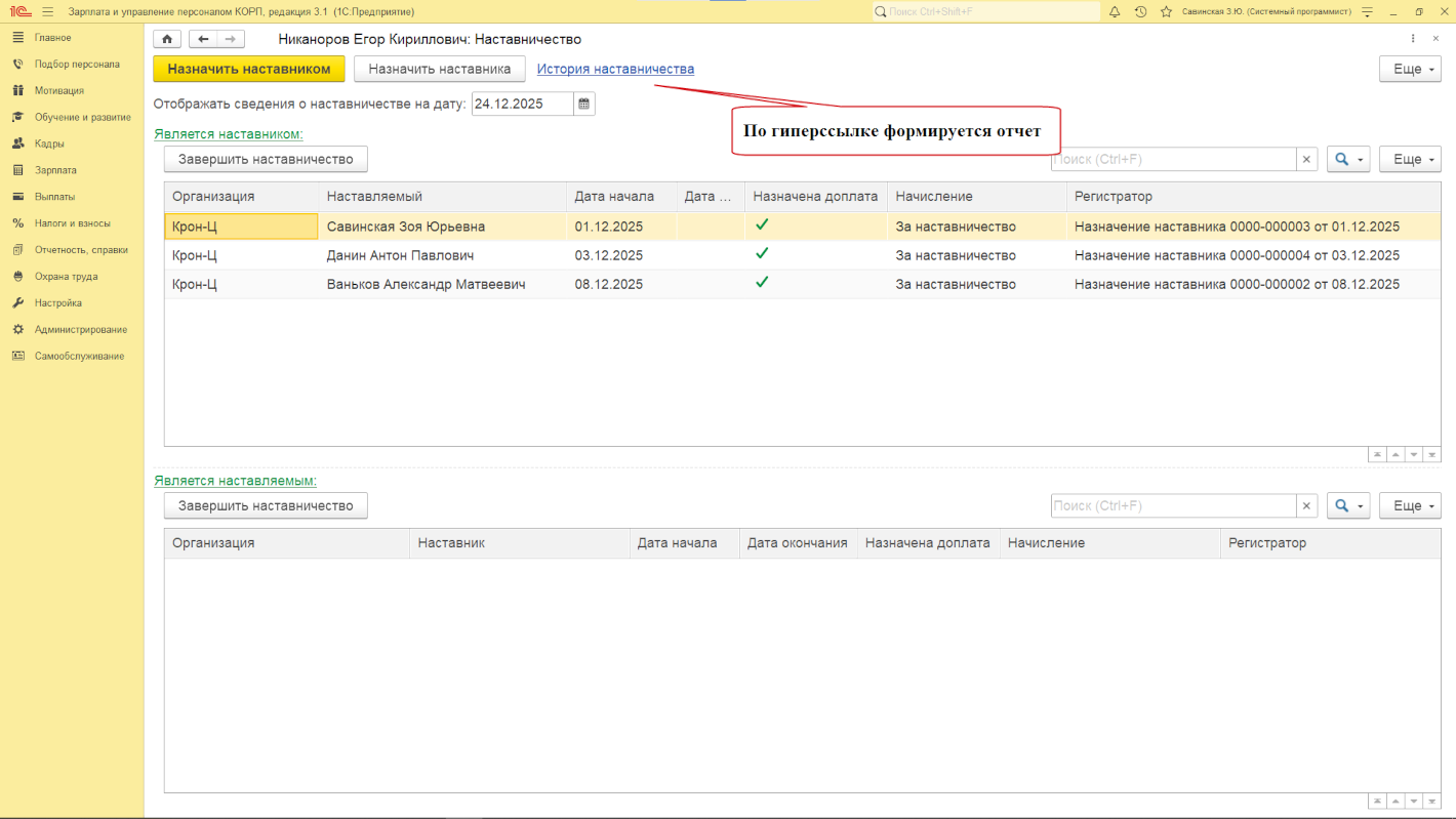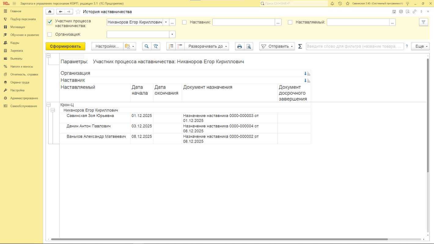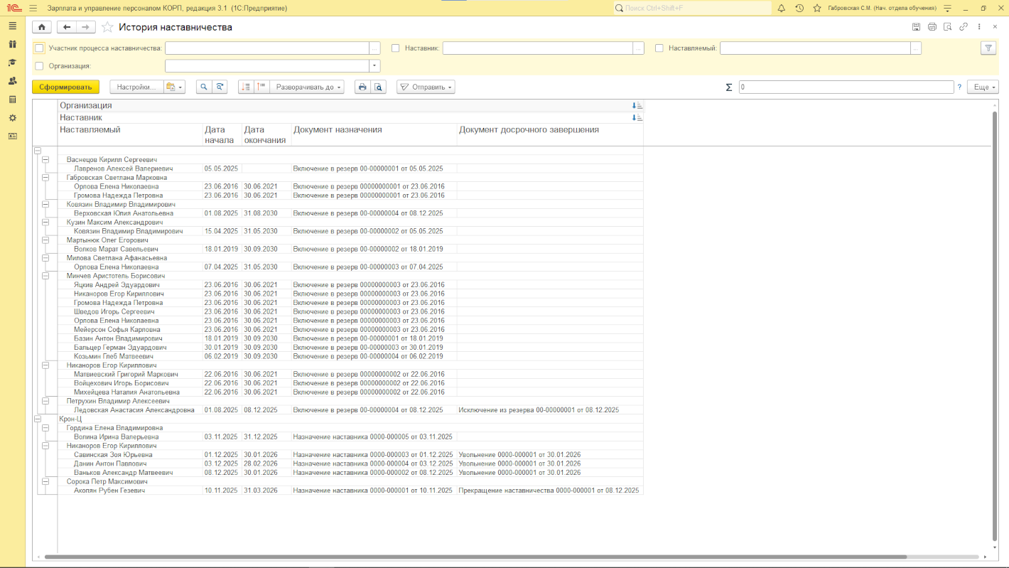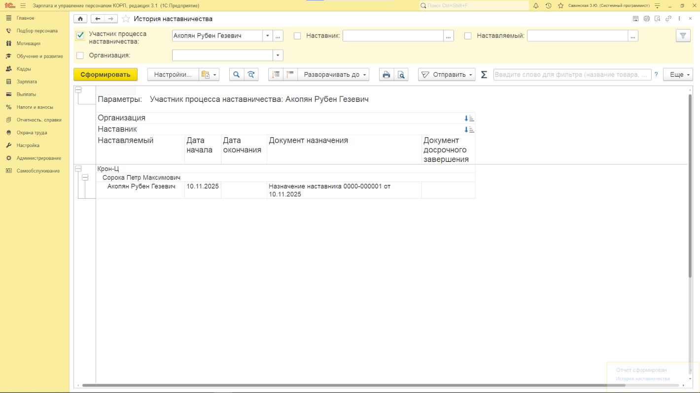 Здесь же можно сформировать отчет История наставничества сотрудника.