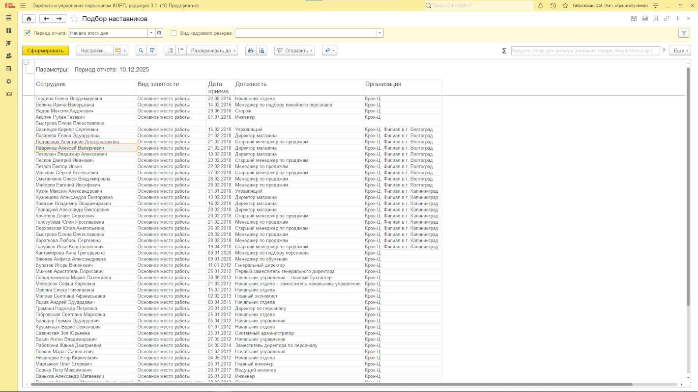 Отчет Подбор наставников показывает информацию о потенциальных наставниках с возможностью отобрать их по должности, подразделению, стажу работы