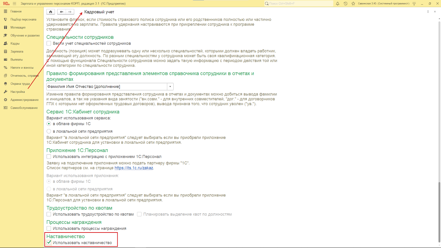 Чтобы начать использовать наставничество в 1С:ЗУП КОРП, Администратор в Настройка/Каровый учет включает опцию Использовать наставничество.