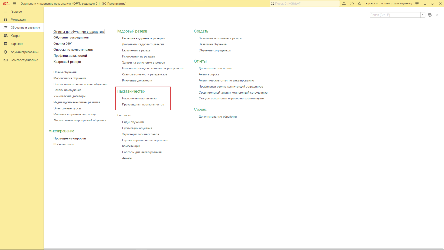 После включения опции в разделе Обучение и развитие появляется группа Наставничество.