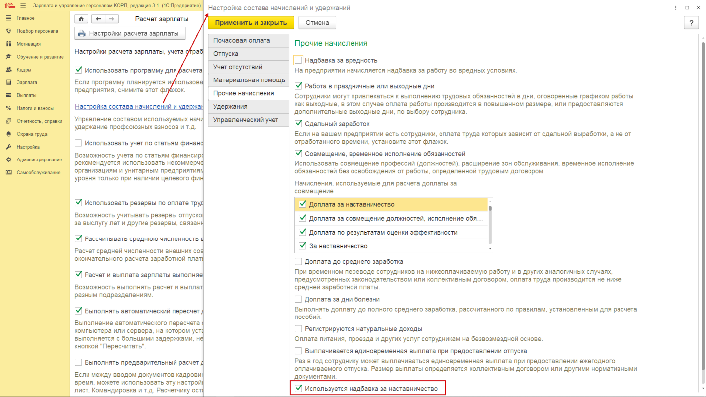 Чтобы назначать надбавки за наставничество Администратор в Настройка/Расчет зарплаты/Настройка состава начислений и удержаний на вкладке Прочие начисления включает опцию Используются надбавки за наставничество.