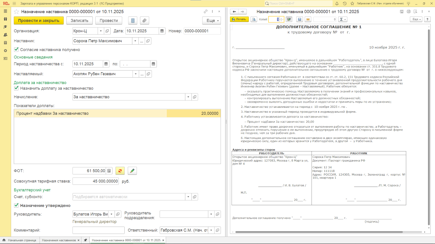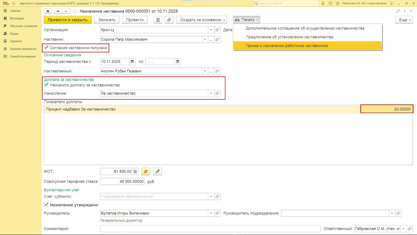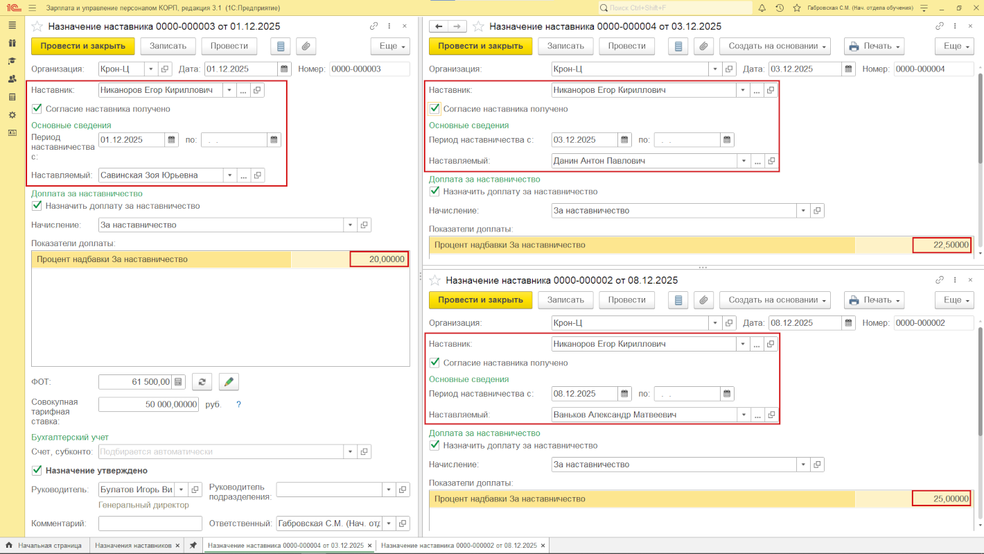 Документом Назначение наставничества можно назначать новых наставляемых и изменять размер доплаты за наставничество.