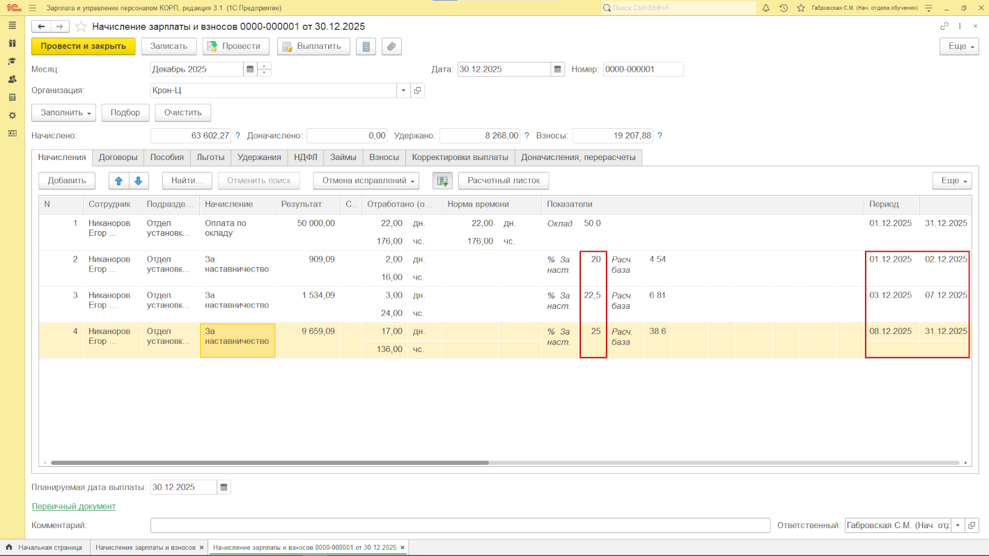 - Назначать или изменять доплату за наставничество. Или не назначать доплату, если это не требуется;