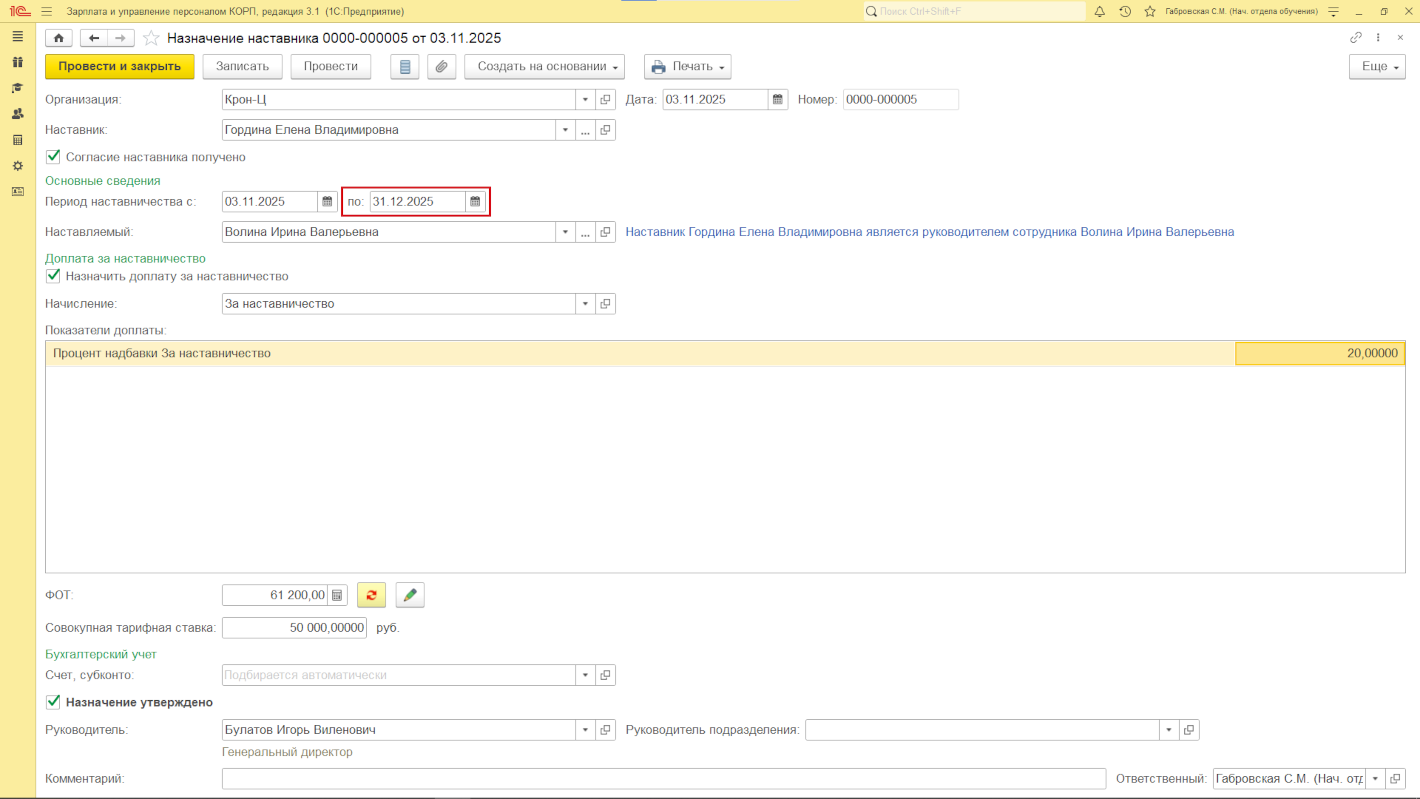 Пример. При назначении наставника указана дата окончания. Наставничество Гординой Е.В над