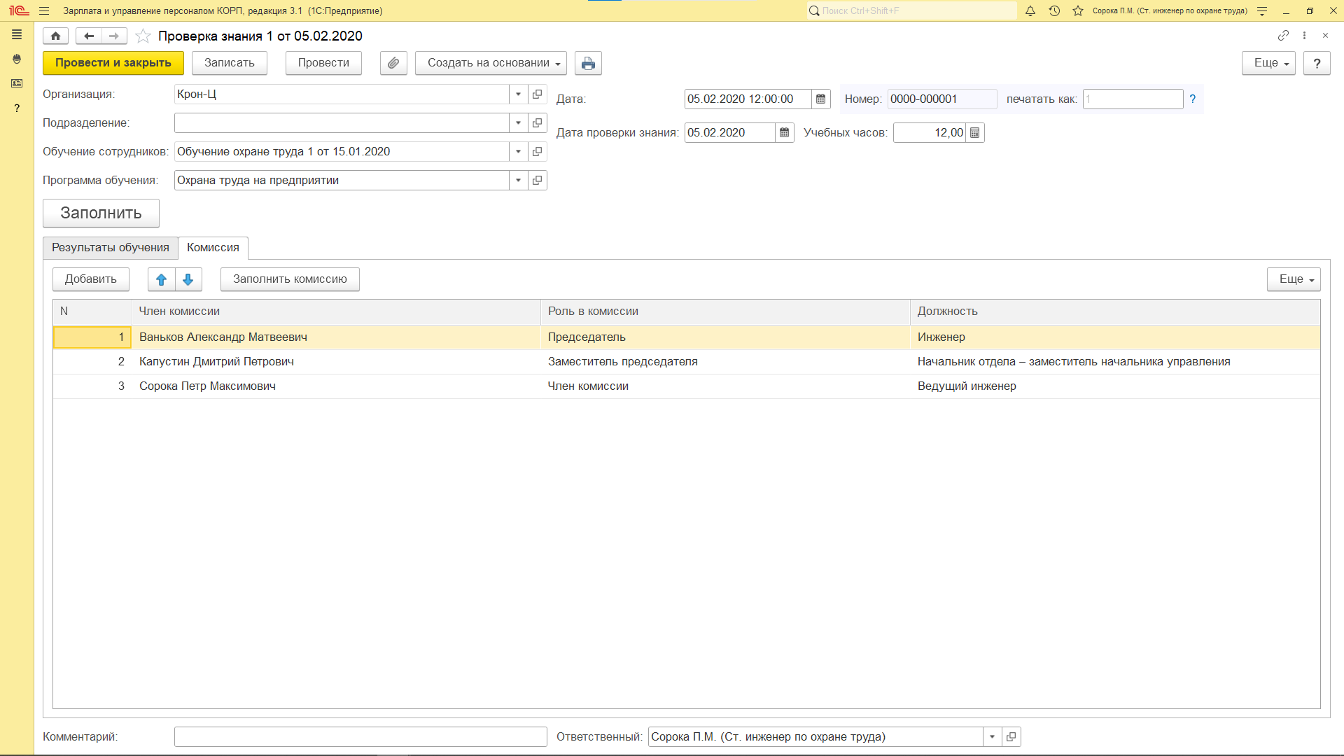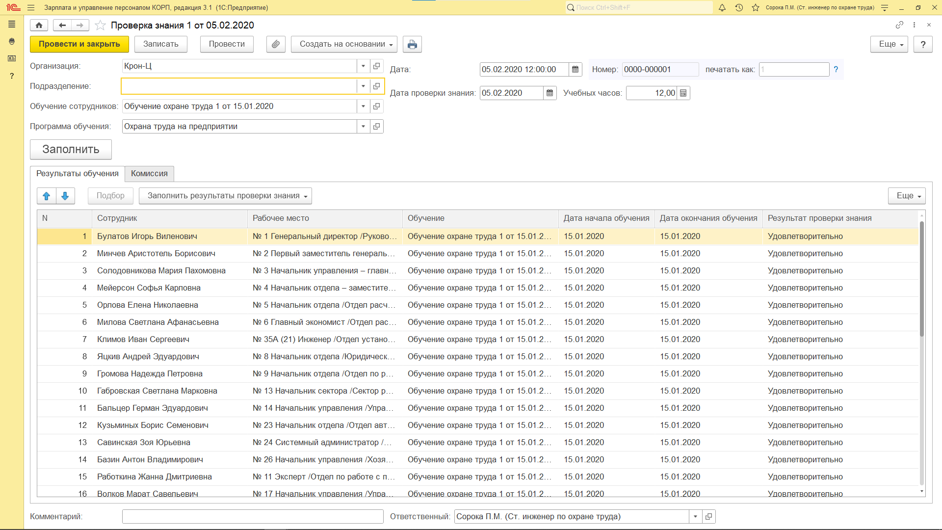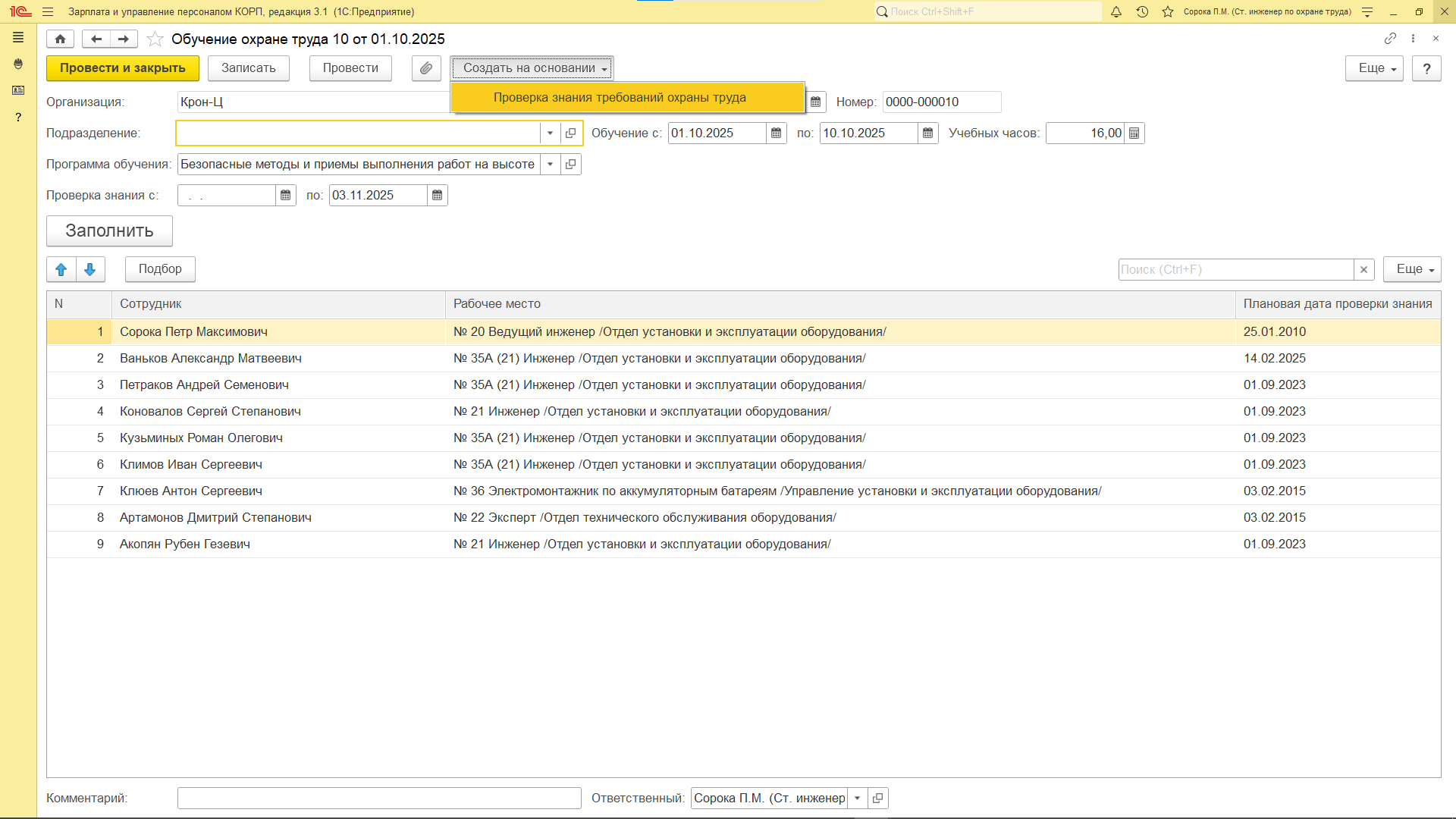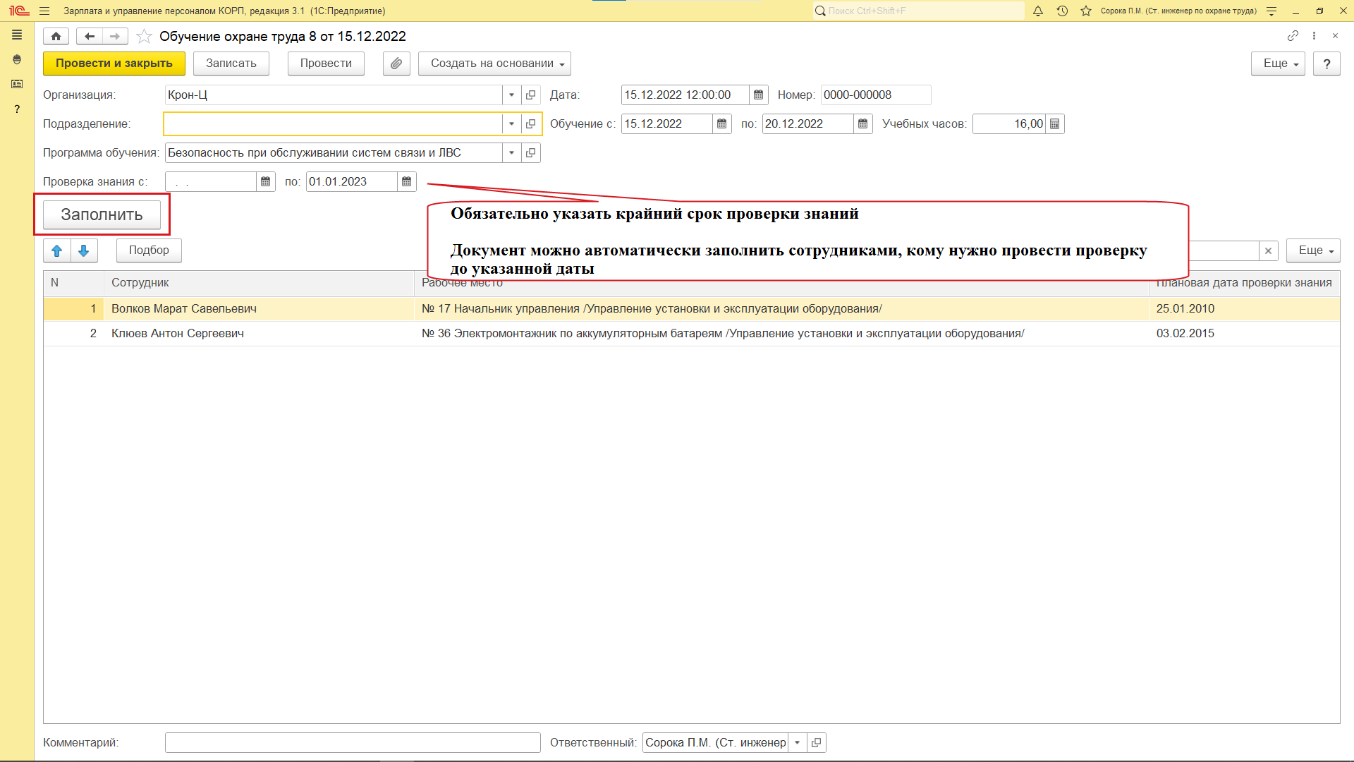 В документе Проверка знаний можно выбрать документ Обучение охране труда и Заполнить список сотрудников.