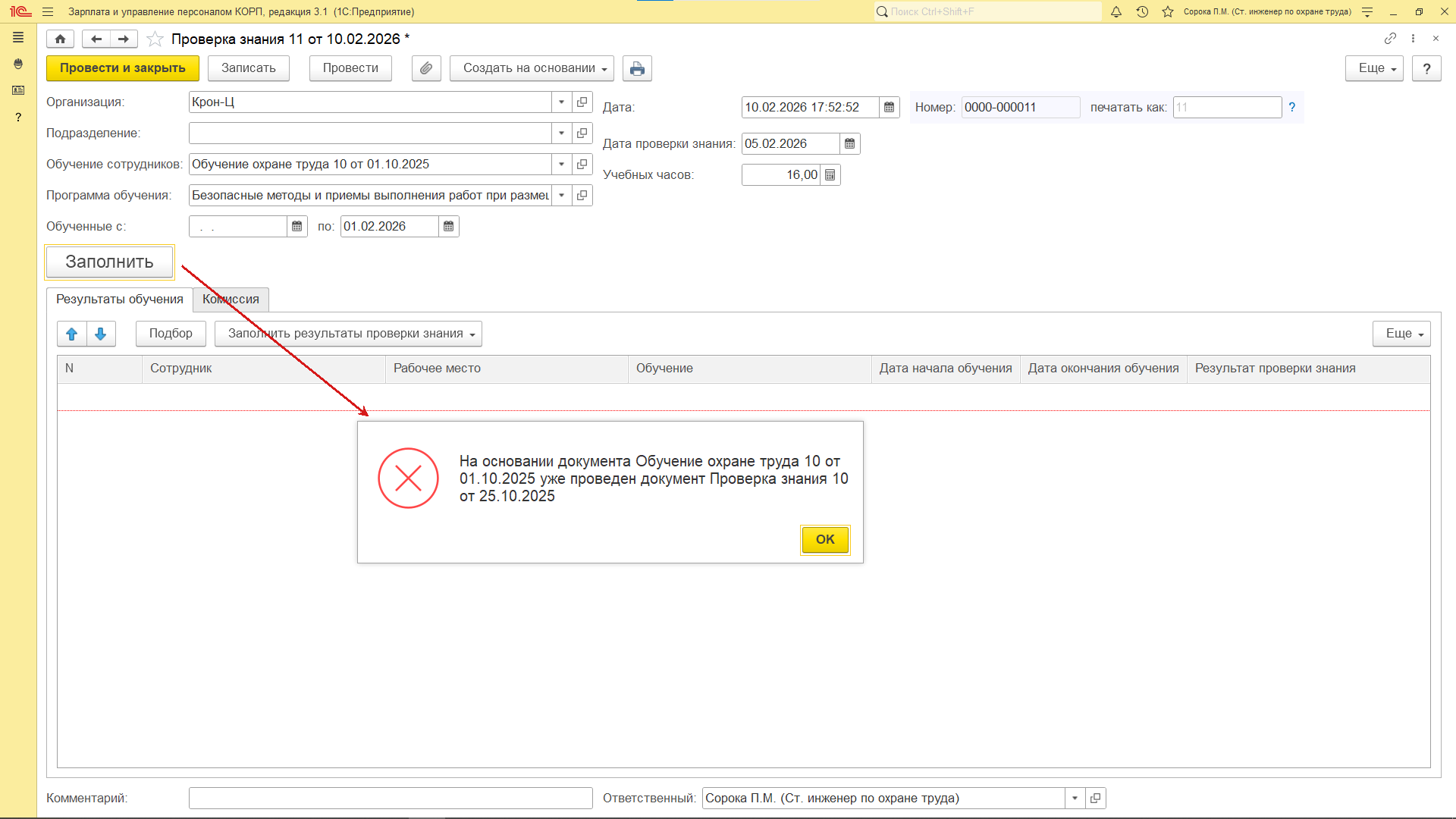 Дважды на основании одного документа Обучение охране труда внести результат проверки знаний невозможно.