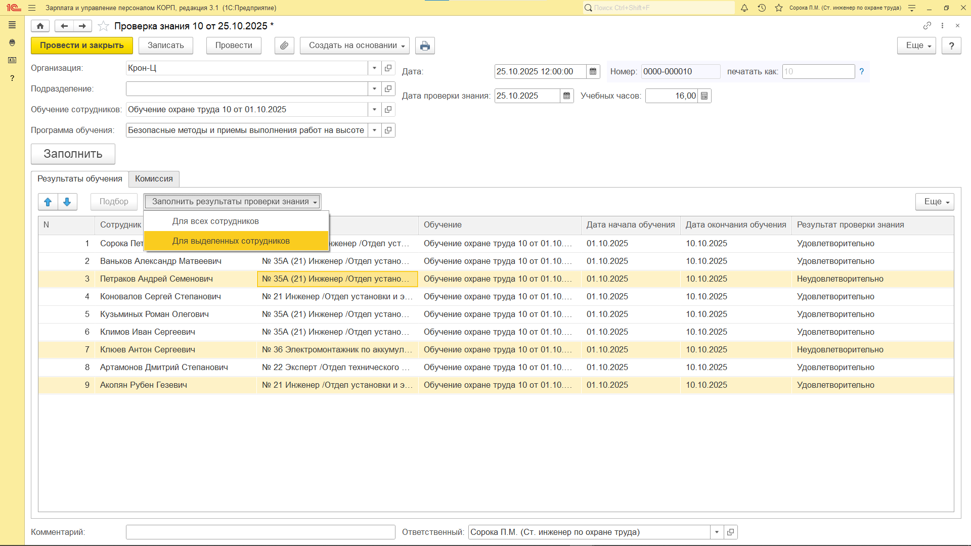 Специалист по охране труда указывает результат проверки знаний: Удовлетворительно или Неудовлетворительно. Результат вводят для всех сотрудников в документе или для выделенных в списке.