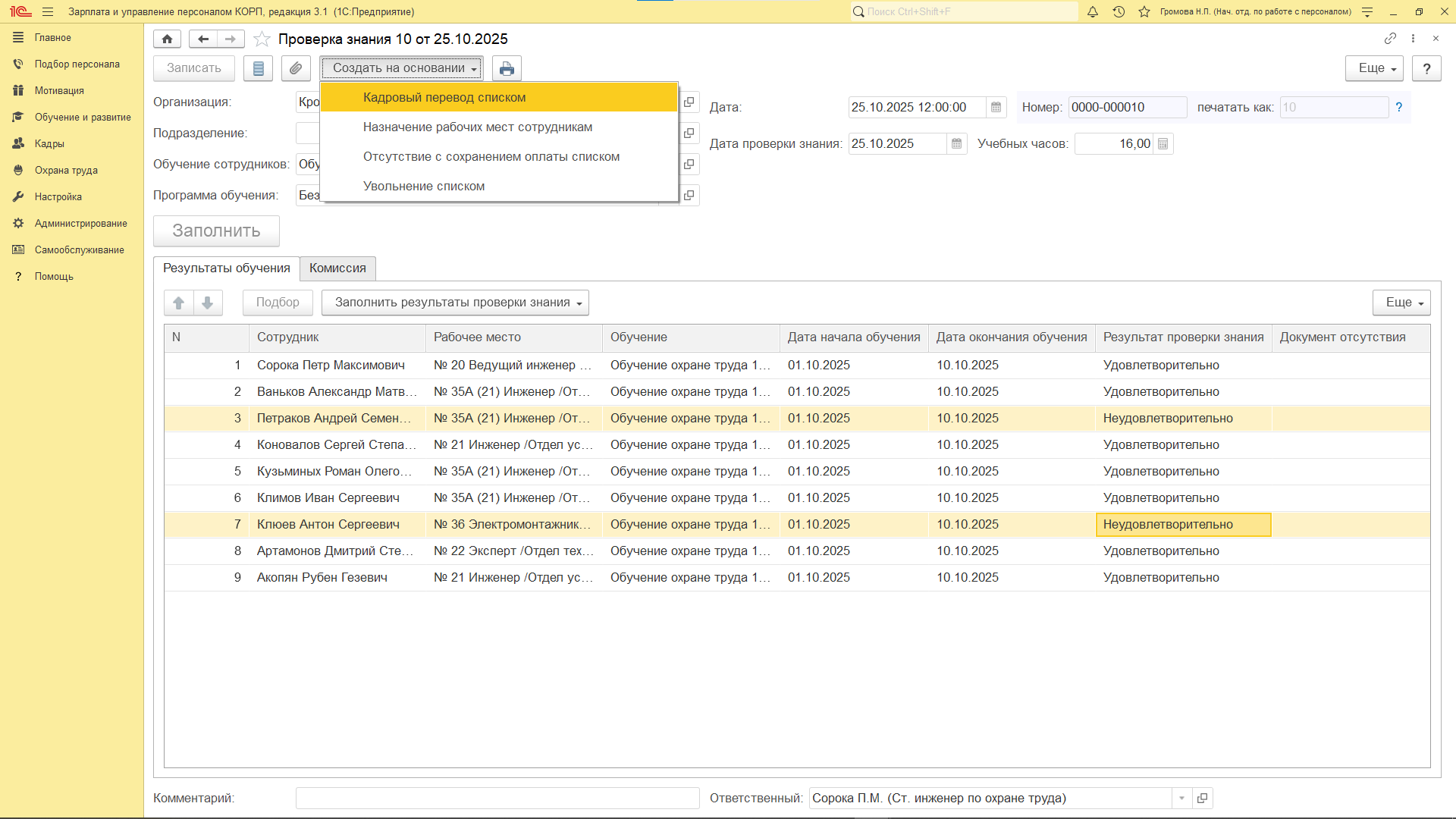 Сотрудникам с неудовлетворительным результатом проверки знаний Кадровик может автоматически создать: