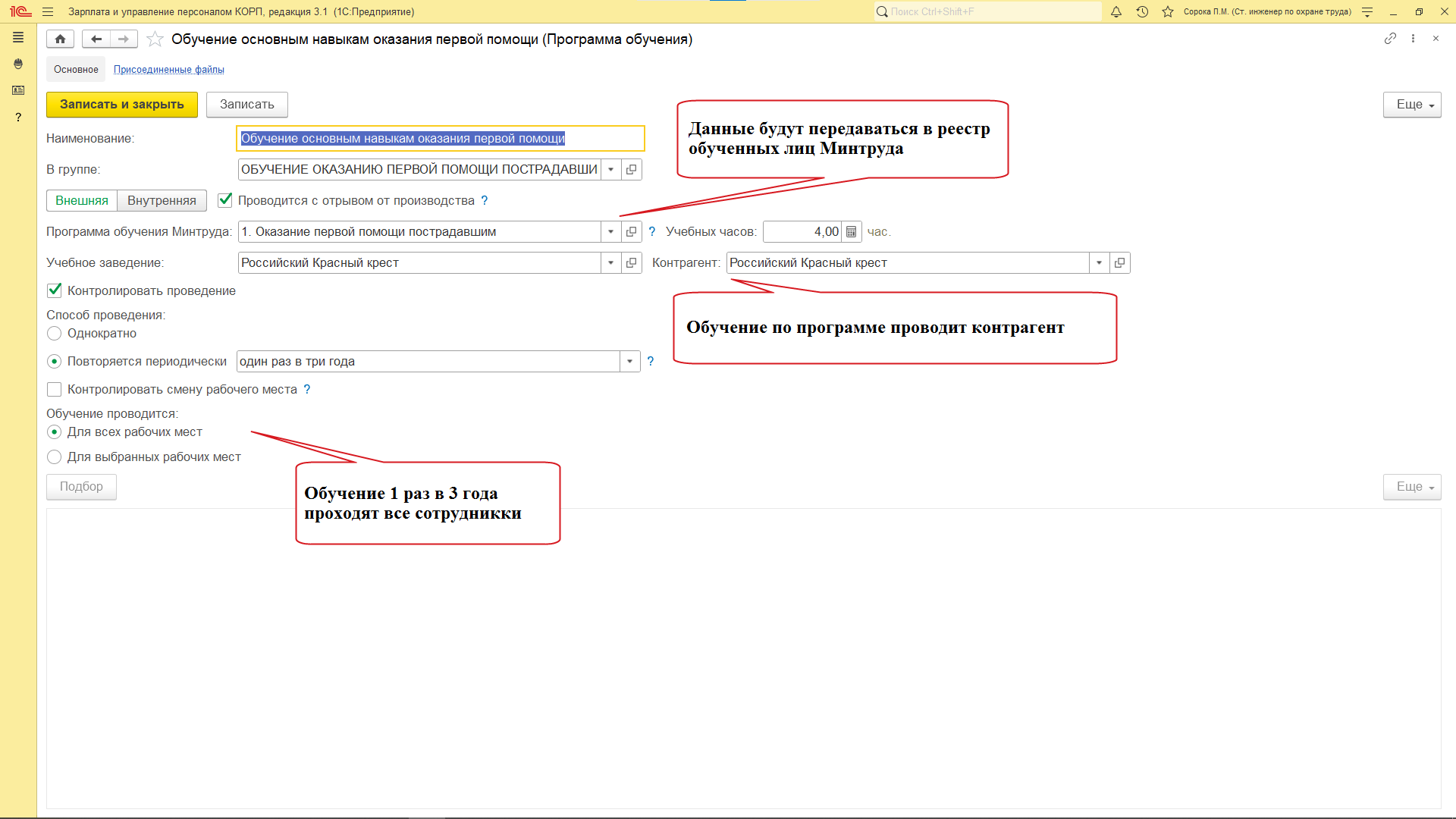 - Выбрана программа обучения Минтруда из классификатора, так как данные должны передаваться в реестр обученных лиц Минтруда;