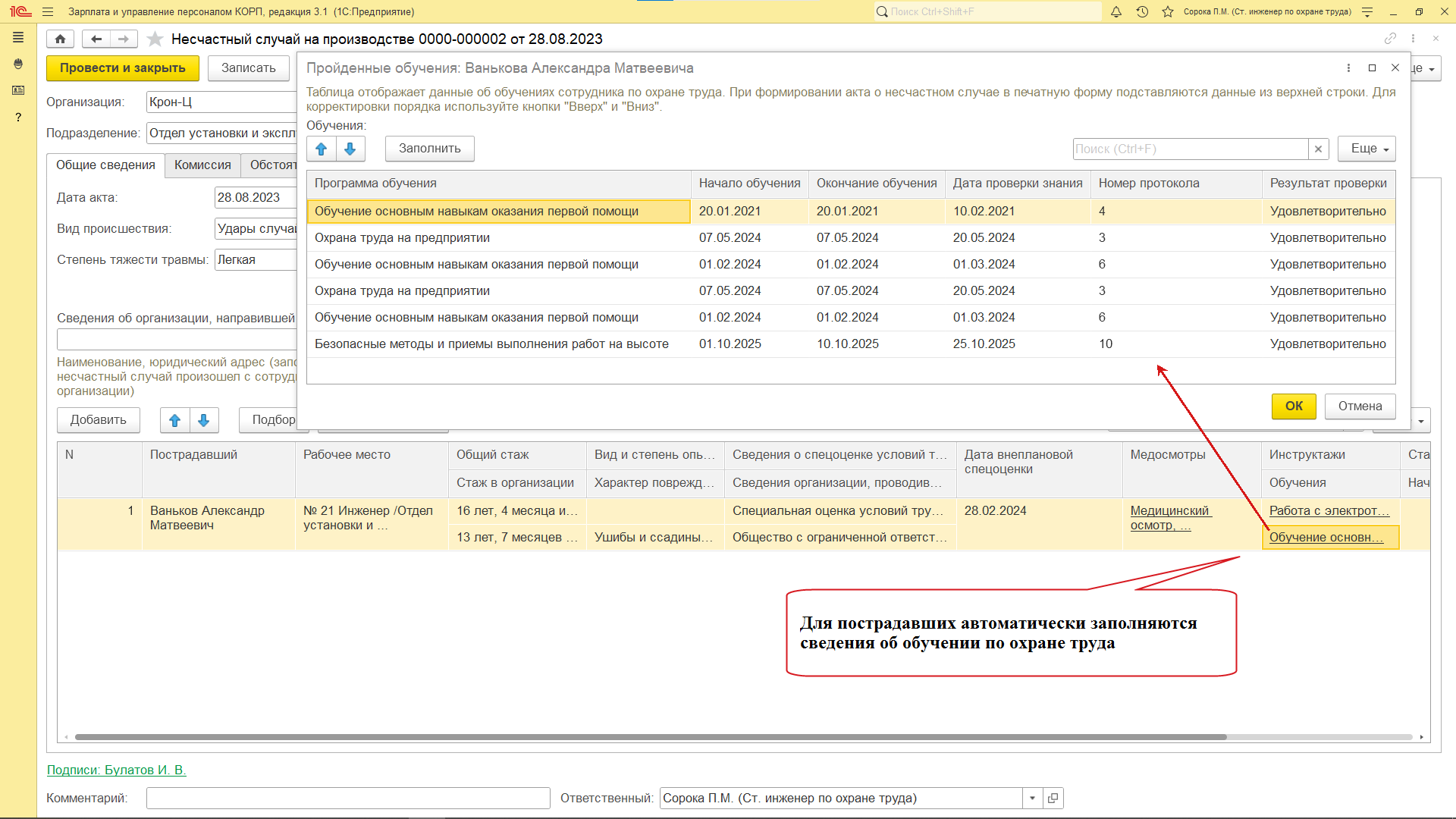 Информация о пройденном обучении охране труда и результатах проверки знаний автоматически заполняется в документах при регистрации несчастных случаев на производстве.