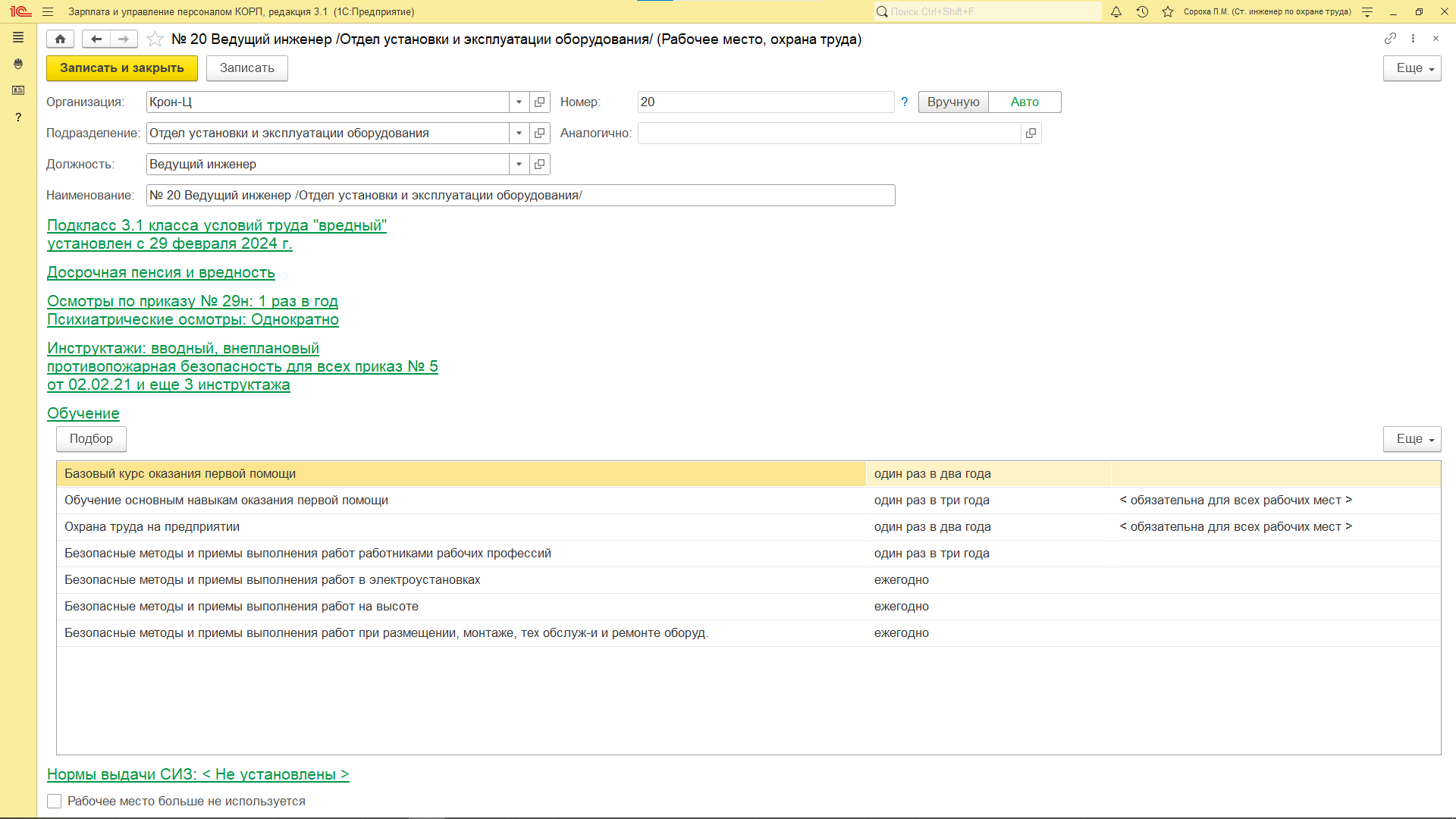 Теперь в карточке рабочего места отражается информация о том, какое обучение по охране труда проходят сотрудники на этом рабочем месте, и его периодичность.