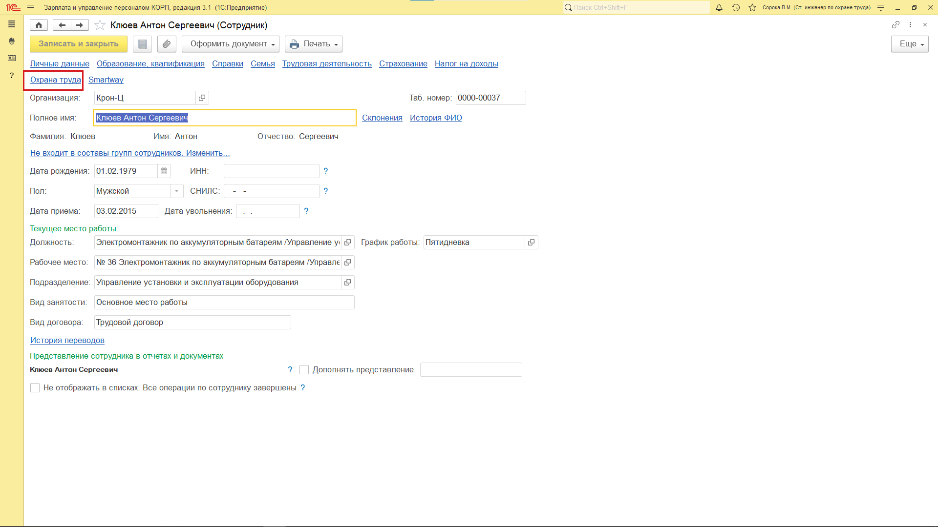 В карточке сотрудника по гиперссылке Охрана труда выводится полная информация о рабочем месте сотрудника, обучении и других мероприятиях по охране труда.