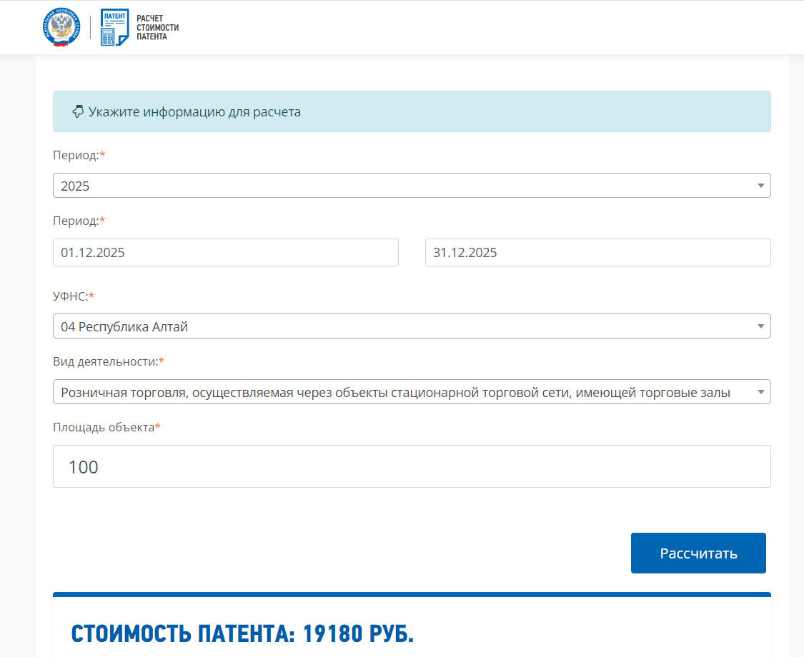 Чтобы определить стоимость патента можно воспользоваться калькулятором на сайте ФНС. Выбираем период действия патента, регион и вид деятельности. Калькулятор рассчитает приблизительную стоимость патента.