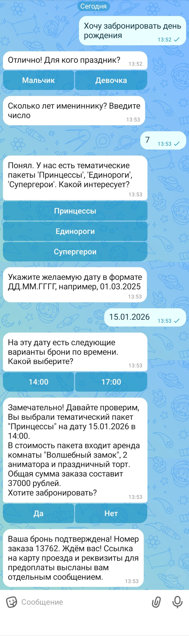 Менеджер тратит часы на объяснение пакетов, проверку доступности комнат и аниматоров, а затем на оформление заказа вручную.