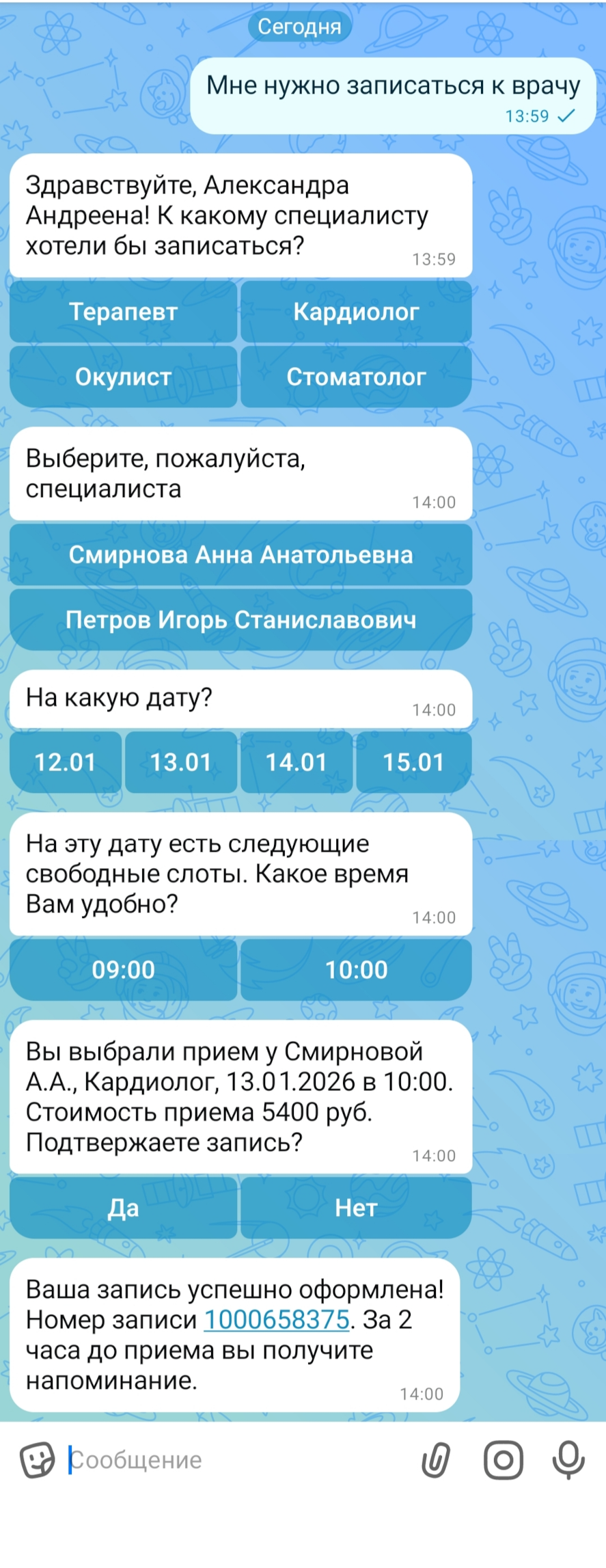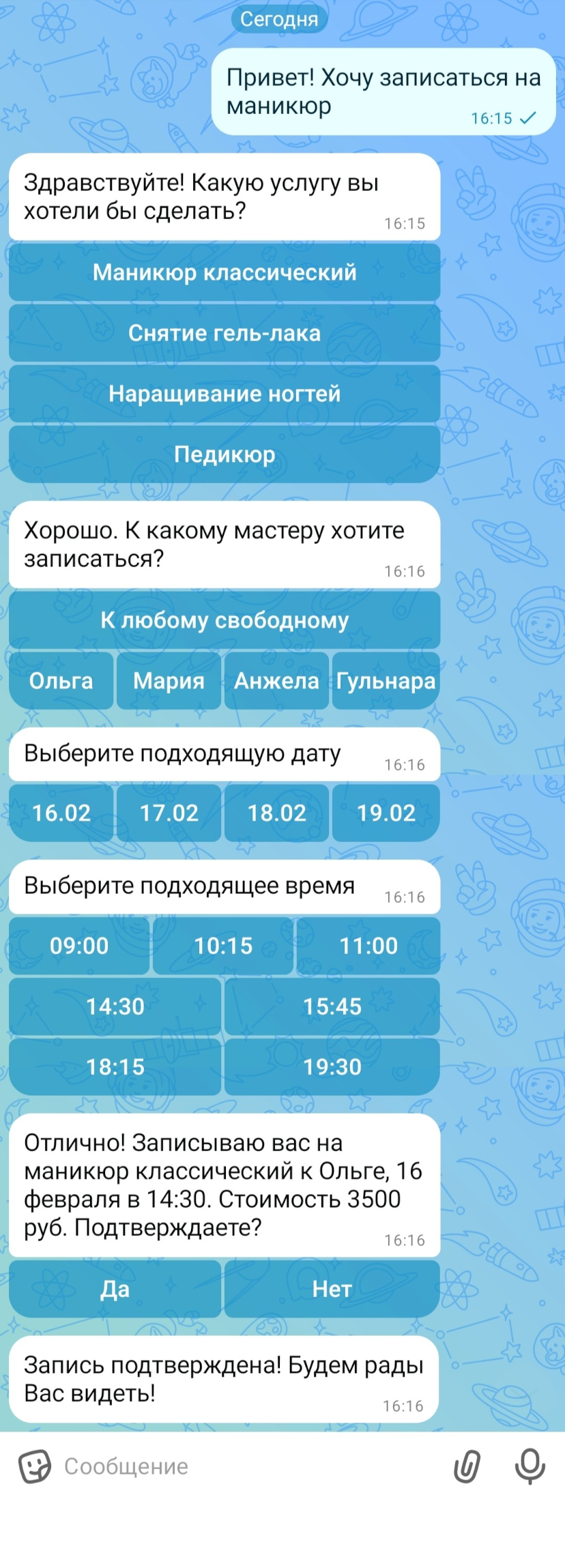 - Выберите удобную дату и время (бот показывает только доступные слоты из календаря, учитывая загрузку персонала, оборудования или помещений).