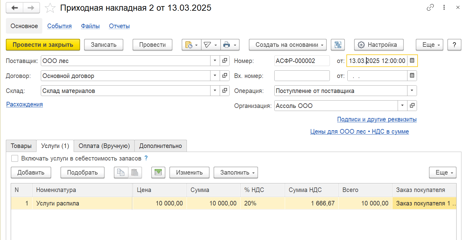 Мы учли основные расходы на материалы, но в процессе производства есть и другие расходы. Например, услуги распила. Их тоже можно привязать к конкретному заказу покупателя.