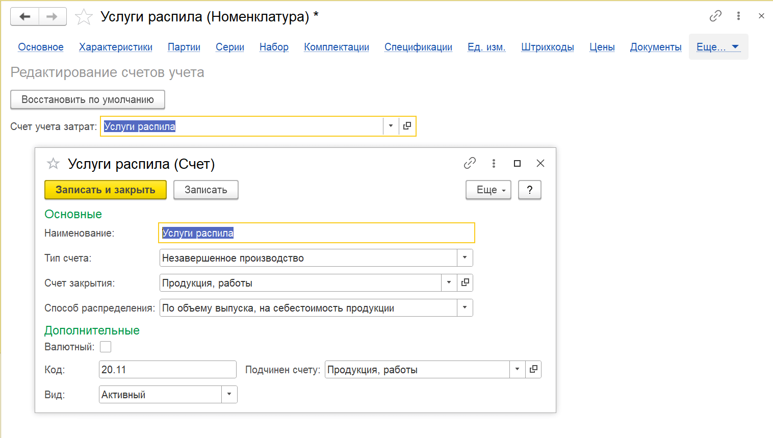 Для корректного учёта сторонних услуг нам необходимо настроить счета учета для номенклатурной позиции «Услуги распила». Установите тип счета «Незавершенное производство» и способ распределения «По объему выпуска, на себестоимость продукции». Таким образом, при закрытии периода услуги будут отнесены на себестоимость изделия.