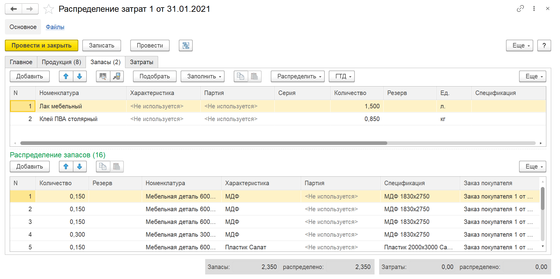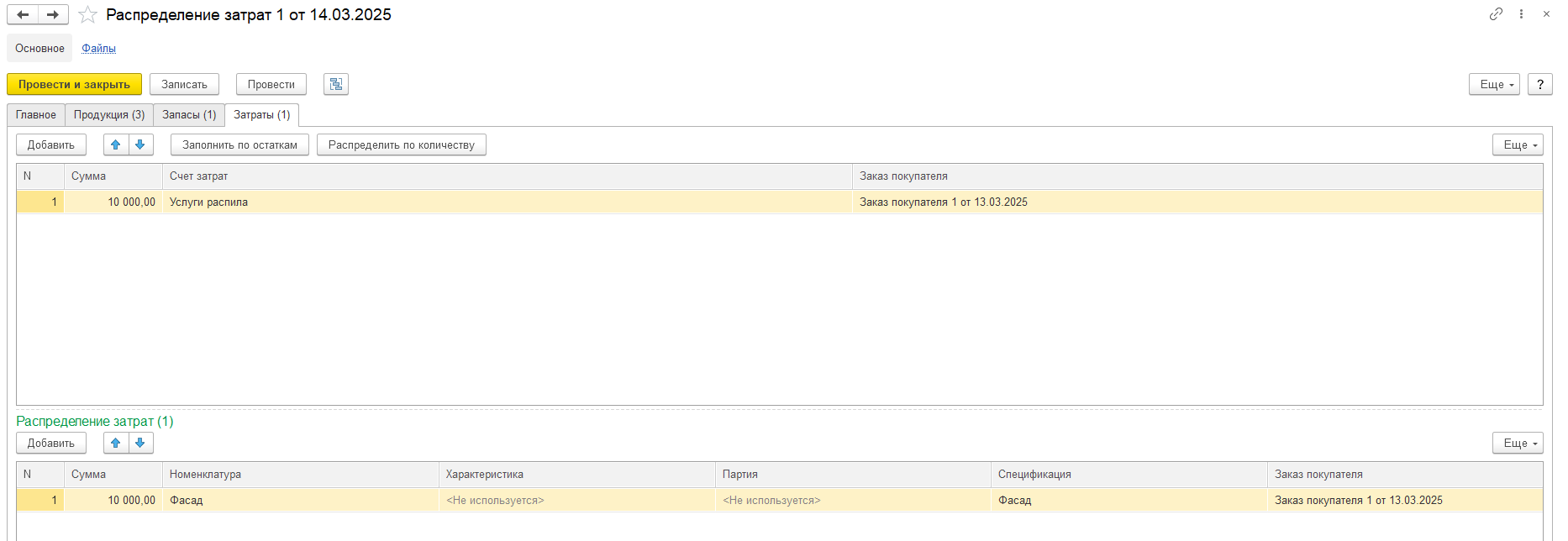 В производстве есть документ «Распределение затрат». Его задача – правильно разнести прямые расходы производства на конкретные заказы. Часть затрат мы уже распределили при вводе документа «Производство» на закладке «Материалы».