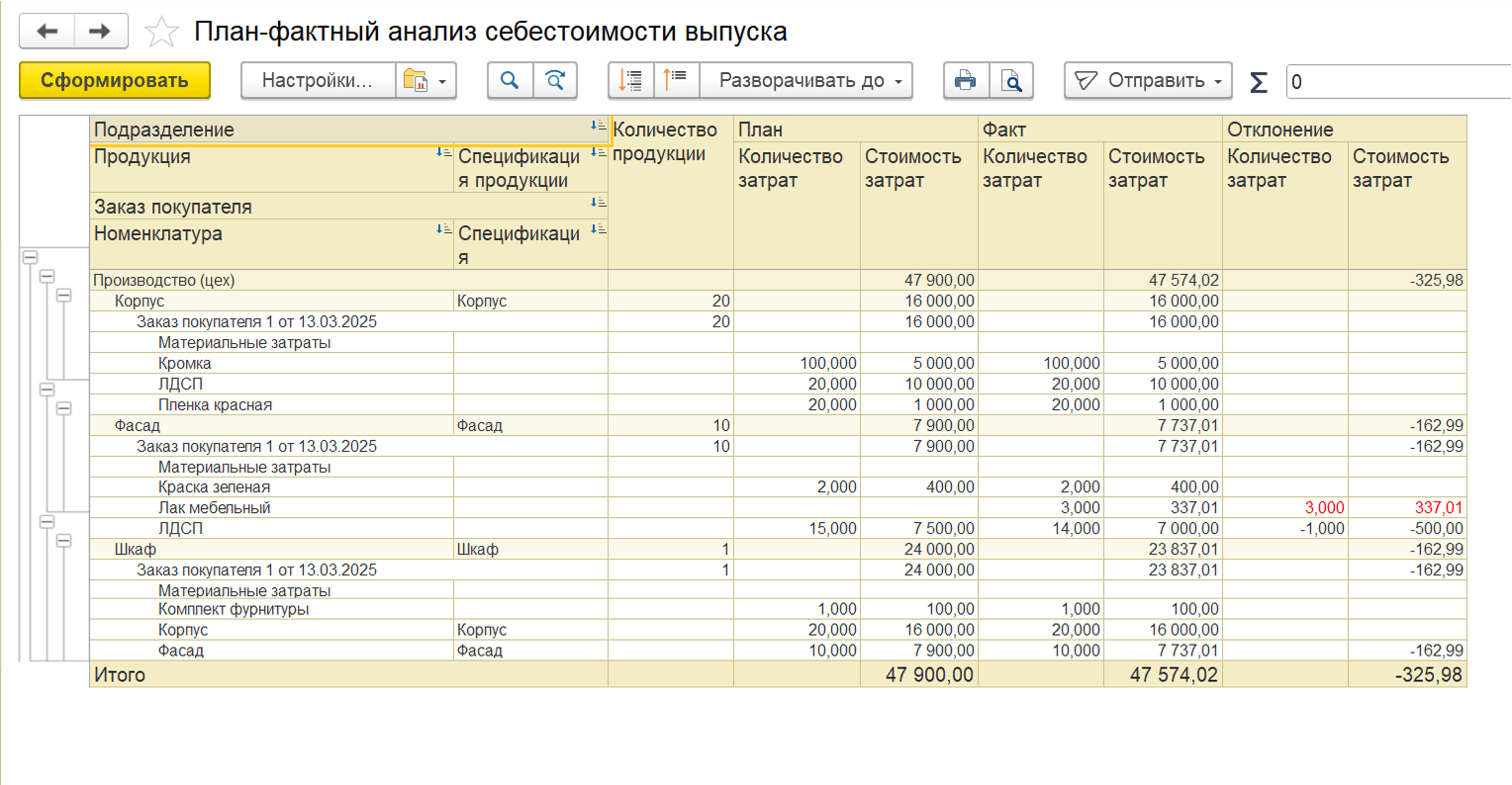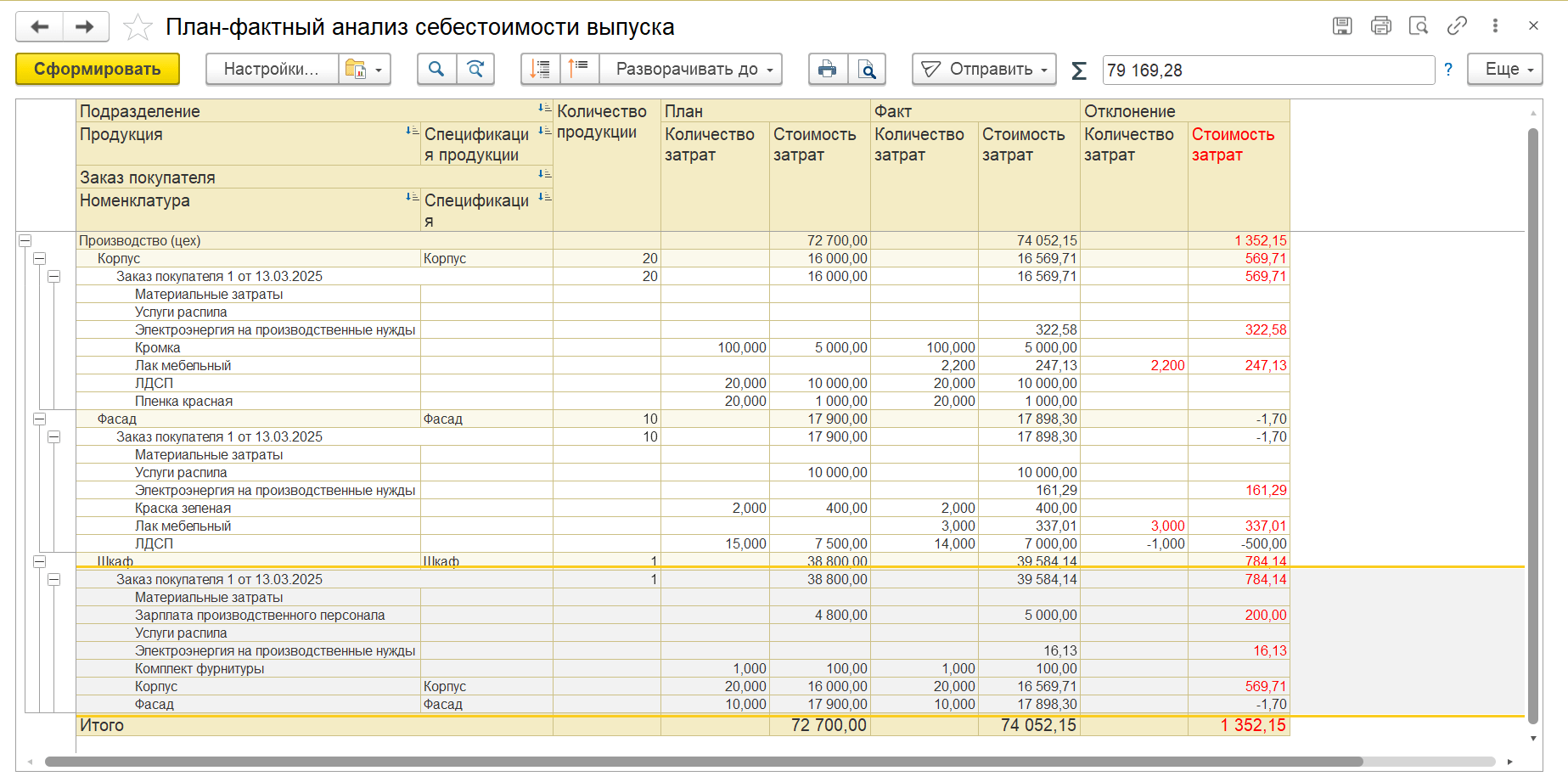 Сформируем отчет «План-фактный анализ себестоимости выпуска». В данном случае посчиталась себестоимость отдельно корпуса, отдельно фасада, отдельно зарплата и другие дополнительные затраты. В данном отчете мы можем видеть полностью весь учет вместе с дополнительными расходами. Благодаря этим механизмам мы можем фиксировать себестоимость выпуска.